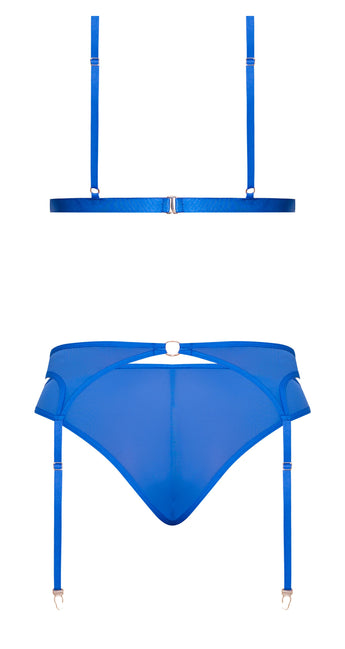 Sassy Bra, Garter and Rouched Panty Cobalt 2XL from Magic Silk Lingerie. Style: M260 Item: Magic Silk Bra, Garter & Rouched Panty. Colors: Black, Cobalt. Each sold separately. Sizes available: S/M, L/XL, 2XL, OQ, One Size Queen. From the Exposed by Magic Silk collection, this style includes: a triangle bra featuring ribbon like adjustable straps with gold tone sliders, swan hook closure in the back, a matching garter with adjustable straps and gold tone sliders, gold O-ring details. Throughout, and a matching panty featuring a rouched design in the back. Soft, stretch mesh with sleek gold metal details. Fabric blend: 92% Polyester, 8% Spandex. Plus Size, 2XL, 2 extra large. Ladies dress sizes, ladies plus size 1X/2X. Dress sizes 20 and 22. Care: hand wash cold water. No bleach. Dry flat. Categories: Lingerie, Clothing, Bra Sets, Women's Underwear, Naughty Role Play. 2023.