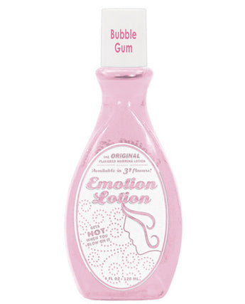 Emotion Lotion Bubble Gum 100ML LU237. Emotion Lotion is the world's original flavored warming massage lotion. Still the #1 selling brand for 45 years! Made from completely edible ingredients. Gets warm when you rub it. Blow on it and it gets hot. Perfect for giving your spouse a romantic massage. Emotion lotion is a great way to set the mood for a night of love-making. Rub it on naked skin to warm it, blow on the body to make it hot and slowly lick it off to taste the luscious bubble gum flavor. This edible, warming massage lotion is water-based and condom-compatible for deliciously safe sex practice. Apply anywhere on your partner or yourself for tasty adult fun and sensational sexual pleasure. Each bottle contains 100ML of delicious personal lubricant. You'll never think of bubble gum the same way again! Just rub the oil on your spouse and then lick it off. Emotion Lotion comes in many different flavors so you can pick the right one for you. Emotion Motion contains the following ingredients: Glycerine, Purified Water, Natural Flavors, Artificial Flavors, FD&C Colors. Emotion Lotion 100ML bottles. Made in the USA. Bottle may change, product will not.