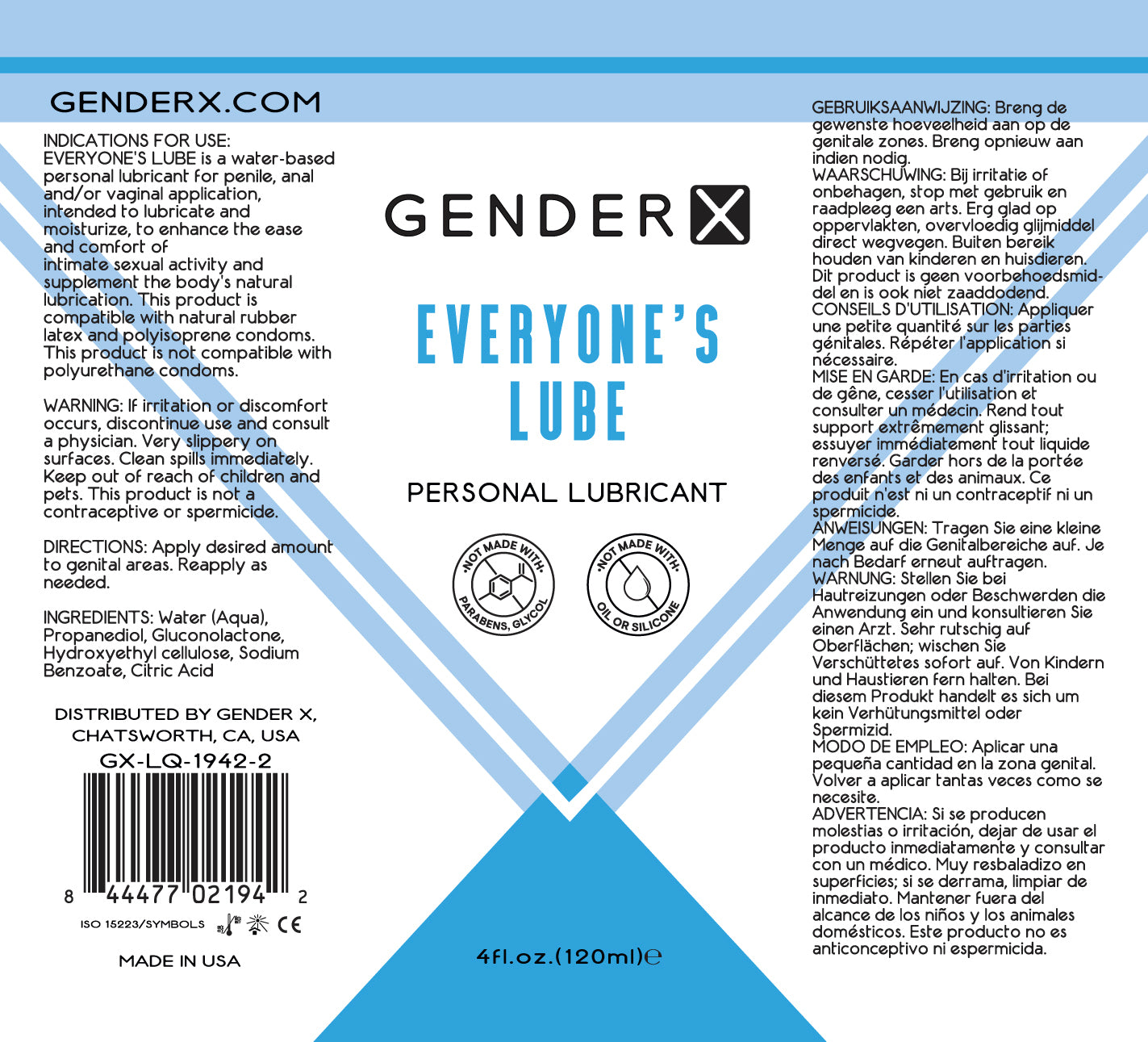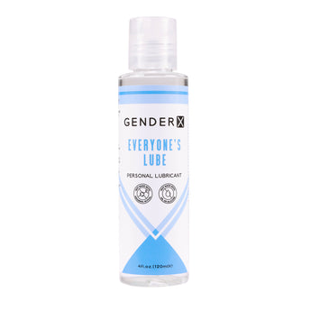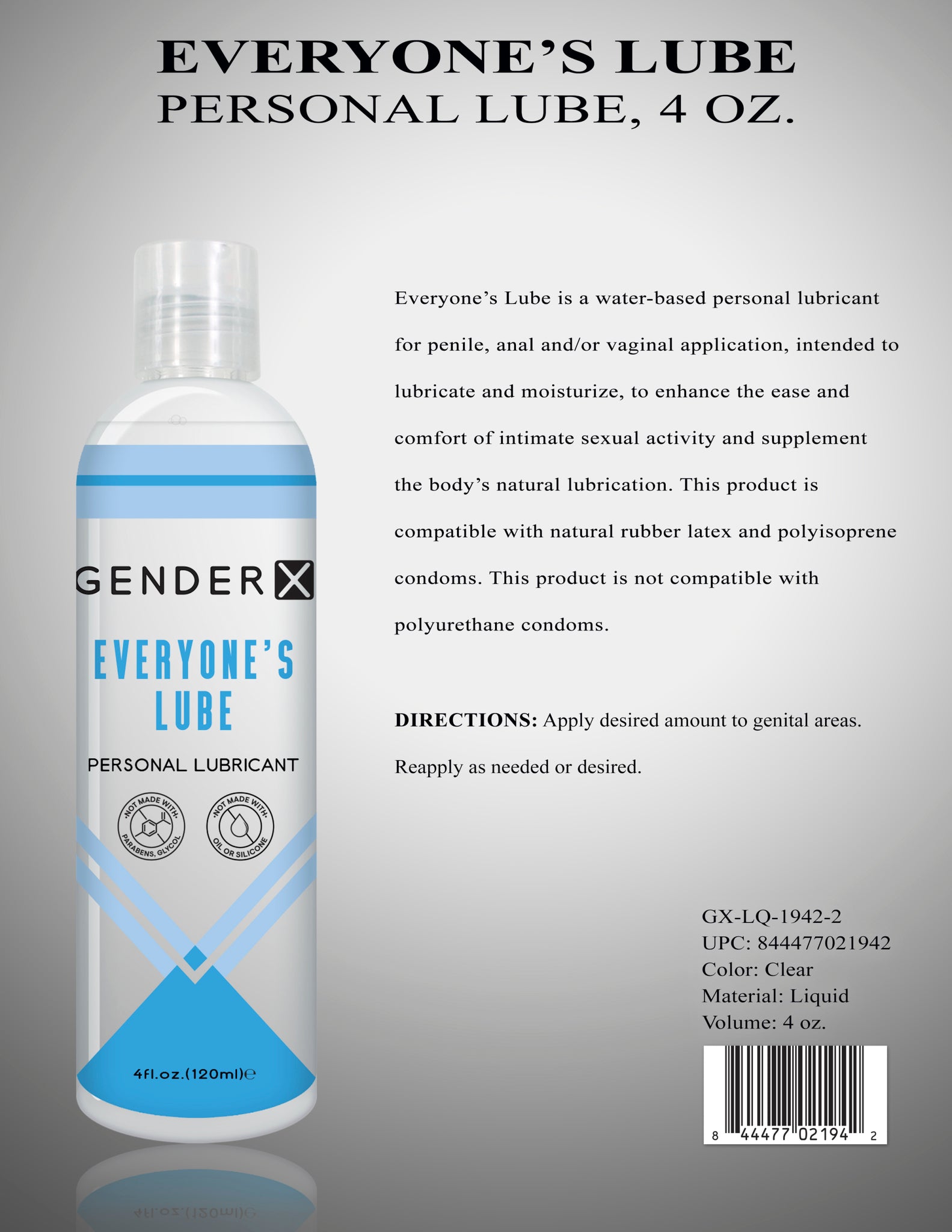 Gender X Everyone's Personal Lubricant 4 fluid ounces from Evolved Novelties. Lubricant is made without Parabens. Not made with oil. Indications for use for Everyone's Lube is a water based personal lubricant for penile and vaginal application intended to lubricate to enhance ease and comfort of sexual activity and supplement the body's natural lubrication. This product is compatible with natural latex and Polyisoprene condom. Not compatible with Polyurethane PU condoms. Warning: if irritation or discomfort occurs discontinue use. Consult a physician. Very slippery clean up spills immediately. Keep out of reach of children and pets. Directions: apply desired amount to genitals. Reapply as needed or desired. Color clear. Material liquid. Volume 4 fluid ounces. This product is not a contraceptive or spermicide. Ingredients: Water, Propanediol, Gluconolactone, Sodium Benzoate, Citric Acid. Categories: Anal Toys, Lubricants, Water Based Lubricant, Anal Lubes, Lotions, Sprays, Creams, Health and Beauty Aids, Massage Lotions, Creams. Made in the USA. 2023.