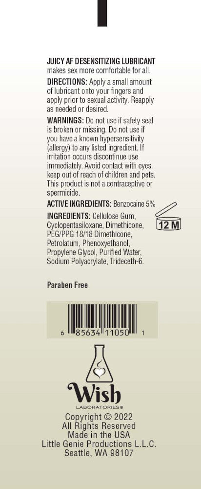 Juicy AF Desensitizing Gel Lube 2 fluid ounces from Little Genie. Juicy AF will make your anal experience more pleasurable. Juicy AF desensitizing gel gently numbs on contact creating a cool and comfortable sensation for anal play. For best results rub a generous amount around anal opening and wait 5 minutes for full activation before engaging in intercourse. Juicy AF Desensitizing was created with the intention of creating a more pleasurable and comfortable sexual experience for lovers. Categories: Desensitizing Lubricant, Gels, Anal Lubes, Lotions, Sprays, Creams, Sex Toys for Couples, Health and Beauty. 2022.