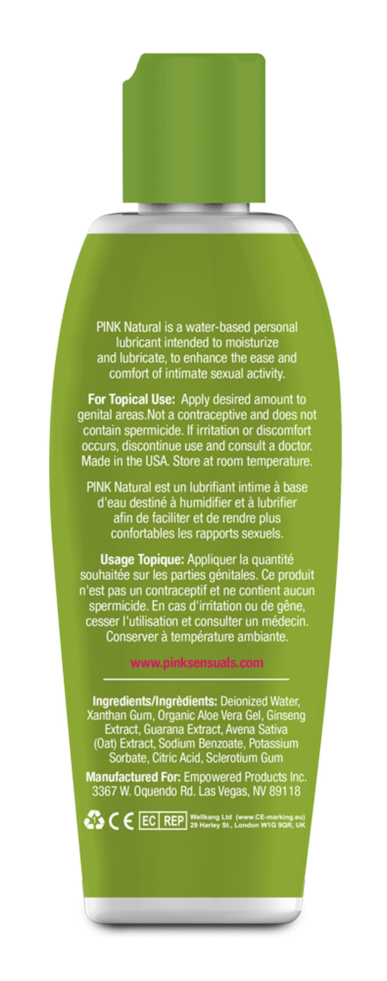 PINK Natural is our new water-based lubricant designed for women and couples looking for very high-quality body-conscious formulations. PINK Natural combines de-ionized water and organic Aloe Vera, fortified with extracts of Ginseng, Guarana and Avena Sativa (Oat). We minimized or removed most other ingredients from our very popular PINK Water formula to create PINK Natural.