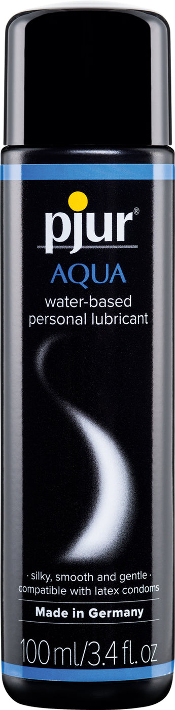 Pjur Aqua Water Based Lubricant 100ml or 3.4 ounces bottle is a water based personal lubricant for penile and/or vaginal application, intended to moisturize and lubricate, enhance the ease and comfort of intimate sexual activity and supplement the body's natural lubrication. This product is compatible with natural rubber latex condoms only. Directions for use: apply to any area of the body where you desire extra moisture. Replace cap after use. Safe for daily use. Store at room temperature. Ingredients: Water, Glycerin, Ethoxydiglycol, Hydroxypropyl Guar, Hydroxypropyltrimonium Chloride, Hydroxyethylcellulose, Propylene Glycol, Citric Acid, Benzyl Alcohol, Methylchloroisothiazolinone, Methylisothiazolinone. Warnings and precautions: do not use on irritated or infected skin. If irritation or discomfort develops, discontinue use and consult a healthcare professional. This product is not a contraceptive and contains no spermicide. Keep out of the reach of children. Avoid contact with eyes. Very slippery on surfaces so clean spills immediately and use special caution in bath and shower areas. Pjur personal lubricants meet the quality standards of US health authorities.