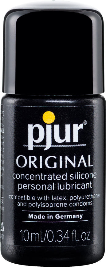 Pjur Original 10ml, .34 ounce bottle is a great travel size personal lubricant. Pjur Original Bodyglide provides extra long lasting lubrication for massage. Pjur Original concentrated Silicone personal lubricant is compatible with latex, polyurethane, and polyisoprene condoms. Original provides ultra long lasting personal lubrication. Enhances the comfort and pleasure of intimacy. May also be used for massage and skin conditioning. Only a few drops are needed. Never gets sticky or dries out. Leaves your skin soft and smooth. Non-irritating for the vaginal mucous skin. Does not block pores. Product is not made with fats, fragrances, paraben, preservatives or water. Neutral taste and odor. Directions for use: apply to any area of the body where you desire extra moisture. Replace cap after use. Safe for daily use. Store at room temperature. Ingredients: Cyclopentasiloxane, Dimethicone, Dimethiconol. Warnings and precautions: do not use on irritated or infected skin. If irritation or discomfort develops, discontinue use and consult a healthcare professional. Product is not a contraceptive and contains no spermicide. Keep out of the reach of children. Avoid contact with eyes. Very slippery on surfaces so clean spills immediately and use special caution in bath and shower areas. Pjur personal lubricants meet the quality standards of US health authorities.