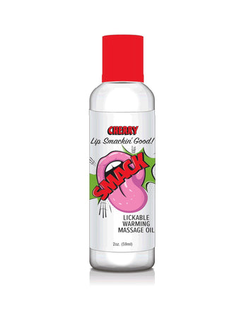 Smack Cherry 2 fluid ounces Warming Massage Oil from Little Genie. Take your partner on a tantalizing flavor journey with Smack Warming and Lickable Massage Oil. Engage in a tasty and playful massage experience in six delectable flavors: Blue Raspberry, Cherry, Passion Fruit, Peach, Strawberry, and Tropical. Each sold separately. Ingredients: Glycerine, Sorbitol, Potassium Sorbate, Sodium Benoate, Xantham Gum, Natural and Artifical Flavors, Assorted Colors. Do not use directly on genitals. Discontinue use if rash or irritation occurs. No medical claims are warranted or implied by use of this product. Made in the USA. Categories: Erotic Body Lotions,Massage Oils, Flavored Massage Oil, Sex Toys for Couples, Oral Products, Oils. 2023.