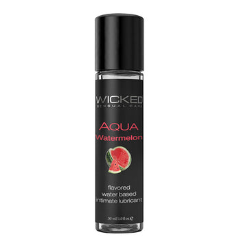 Wicked Aqua Watermelon Flavored Lubricant 1 fluid ounce. Wicked Aqua products are like nothing you have ever felt before. Water based and paraben free, the entire collection is so silky smooth you will be surprised that it is not silicone. Made from the finest ingredients for superior performance, each product has been designed to be amazingly slick, extra long lasting and never sticky or tacky. Clean up is easy with any of the Wicked Aqua products, simply rinse with water and nothing is left behind except your afterglow. The entire Sensual Care Personal Lubricant Collection is designed to tantalize and heighten all of your senses for an incredible journey of sensuality. Flavored personal lubricant. Flavor Watermelon. Volume 1 fluid ounce.