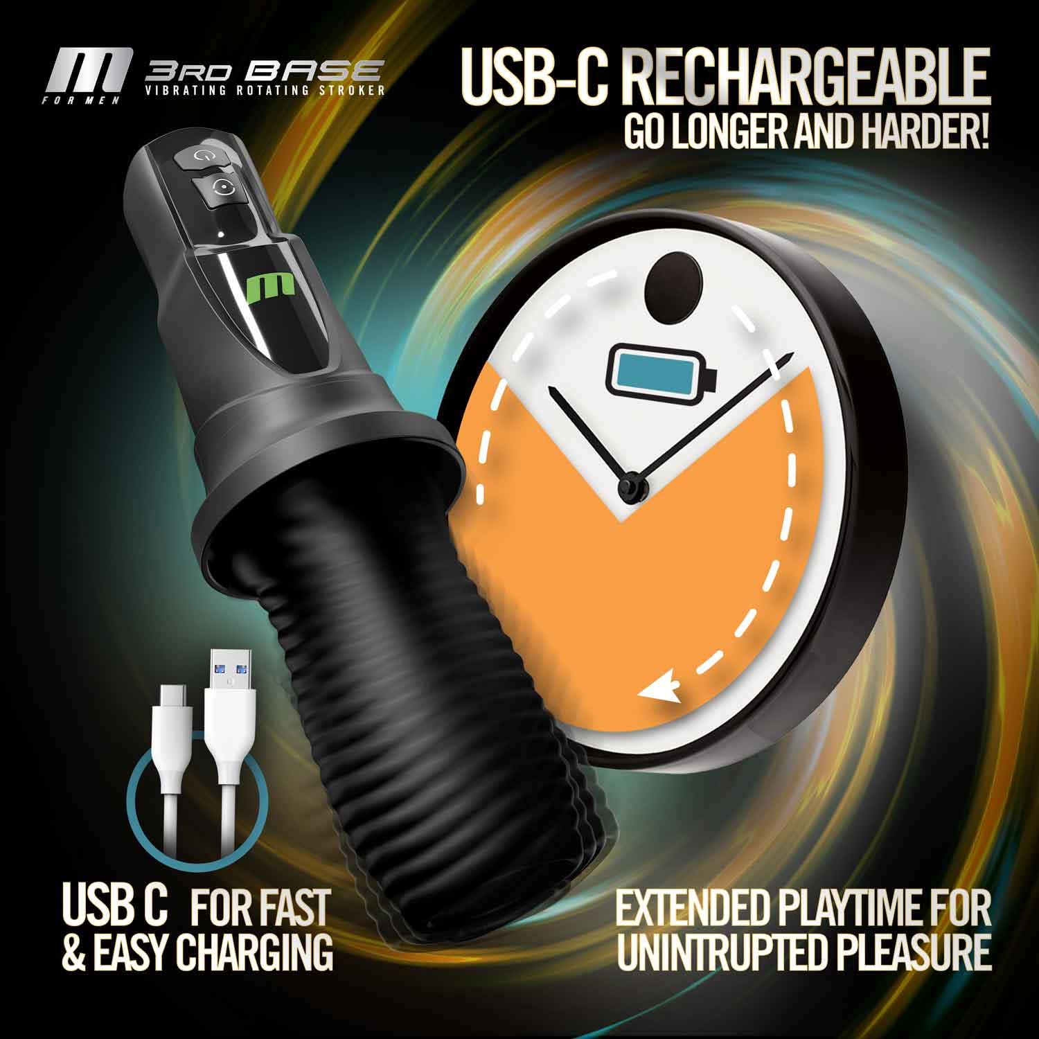 You just got lucky! Get to 3rd Base with this dynamic M For Men oral stroker, engineered for elite performance and satisfaction. Showcasing a sleek and discreet appearance, 3rd Base is designed with a deluxe, ergonomic handle that puts the power of pleasure in your palm. It also comes equipped with a transparent protective case that keeps the inside of your toy pristine. Open to reveal the soft and flexible, wrapped masturbation sleeve that contours to your shaft for a luxurious stroking experience. 3rd Base delivers 7 deep vibration modes, and 7 high-powered rotation modes with advanced 360° rotation that stimulates every inch of you. Soft and textured tongue-like massaging ticklers lick and caress your shaft, delivering a life like oral experience that’s better than your first time! Power up with convenient USB-C charging, enjoying up to 45 minutes of power on a full charge. Step up to the plate and knock it out of the park with this high-tech male masturbator. Are you ready to score?