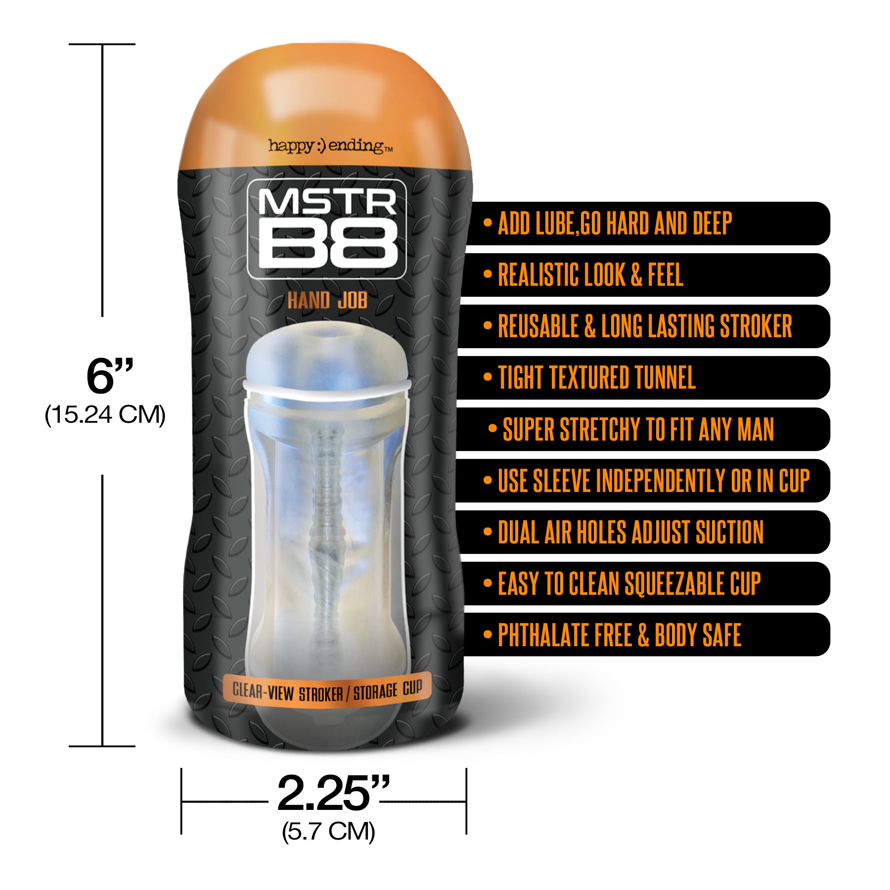 Mstr B8 Clear View Stroker Cup Hand Job from Global Novelties. Happy Endings Stroker from Global Novelties. Add lube, stroke, rinse and repeat. Realistic look and feel that is reusable and a long lasting stroker. A tight textured tunnel that is super stretchy and waterproof. Use sleeve independently or in a cup. Easy to use and easy to clean. Body safe and phthalate free. Clear view stroker and storage case. The MSTR B8 Stroker measures 6 inches long by 2.5 inches wide. It is made from Thermoplastic Elastomers TPE, which makes the stroker feel incredibly soft against your sensitive bits. The storage case is made from non-rigid plastic like a water bottle. That means you can squeeze the case during playtime for extra stimulation. Categories: Male Masturbators, Sex Toys for Men, Masturbators, Masturbation Sleeves. 2023.