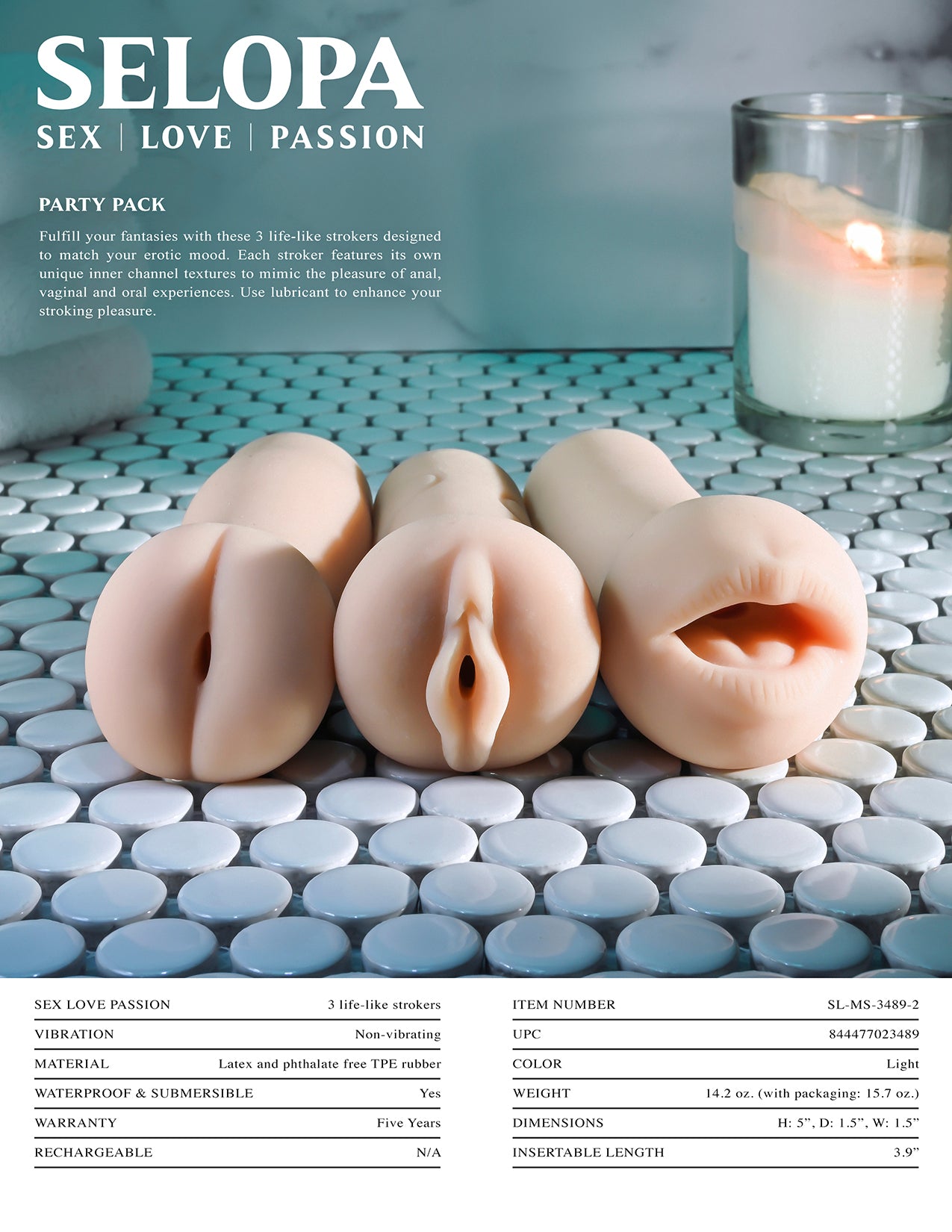 Selopa Party Pack Light Skin Tone 3 different strokers from Evolved Novelties. Fulfill your fantasies with these 3 life like strokers designed to match your erotic mood. Each stroker features its own unique inner channel textures to mimic the pleasure of anal, vaginal and oral experiences. Use a water lubricant to enhance your stroking pleasure.