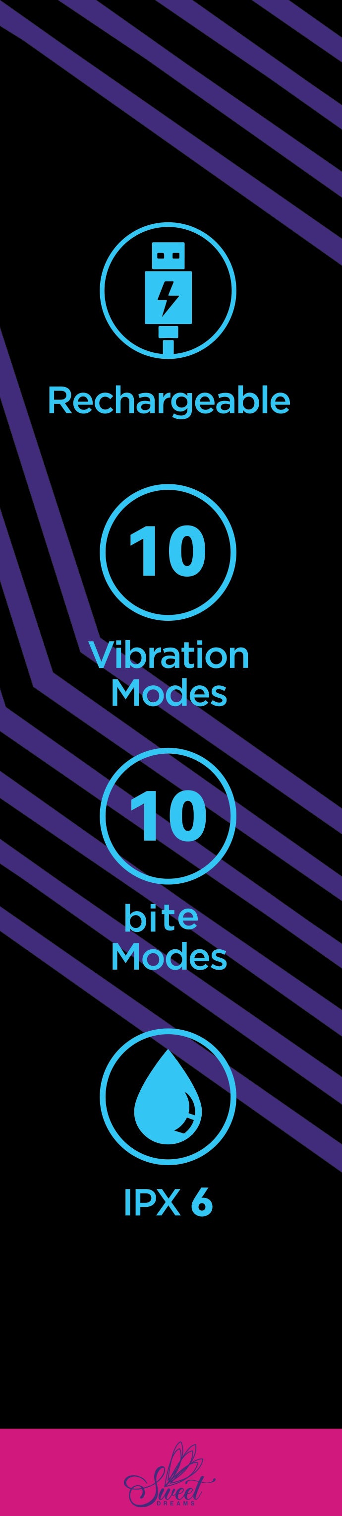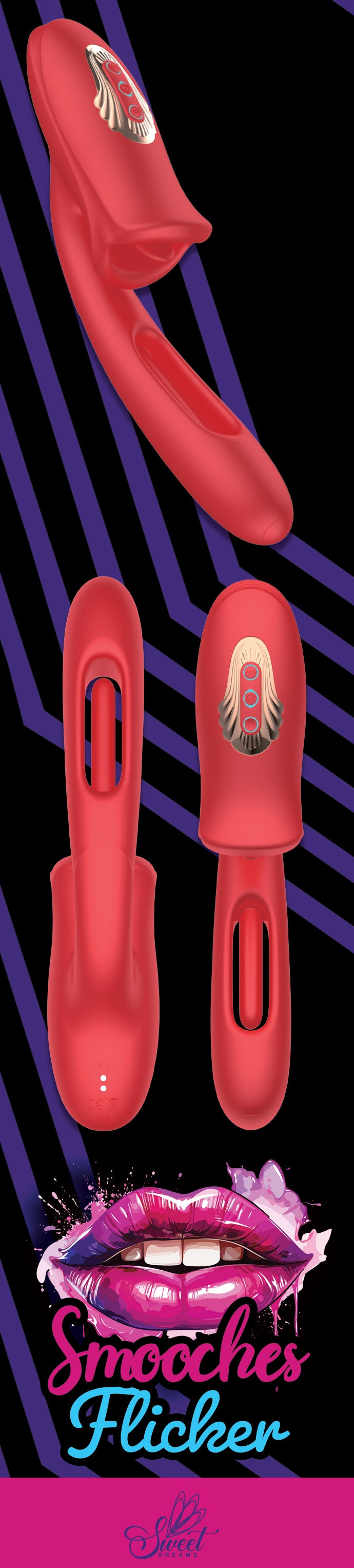 The Smooches Flicker is a versatile vibrator that combines innovation and luxury, offering both internal and external stimulation for couples and solo adventures. It's ergonomic design provides a sensational experience with 10 thrilling vibration modes and 10 euphoric flick patters, ensuring a wide array of sensations to explore. The Smooches Flicker is water resistant (IPX6), Making it suitable for adventurous play! It's dual functionally, providing a fantastic blend of vibration and licking sensations, makes it stand out from all the rest! The Smooches Flicker's sleek and smooth design enhances every smooch and flicker, creating unforgettable moments. Elevate your intimate experiences with the Smooches Flicker, where unforgettable moments can quickly turn into Sweet Dreams!.