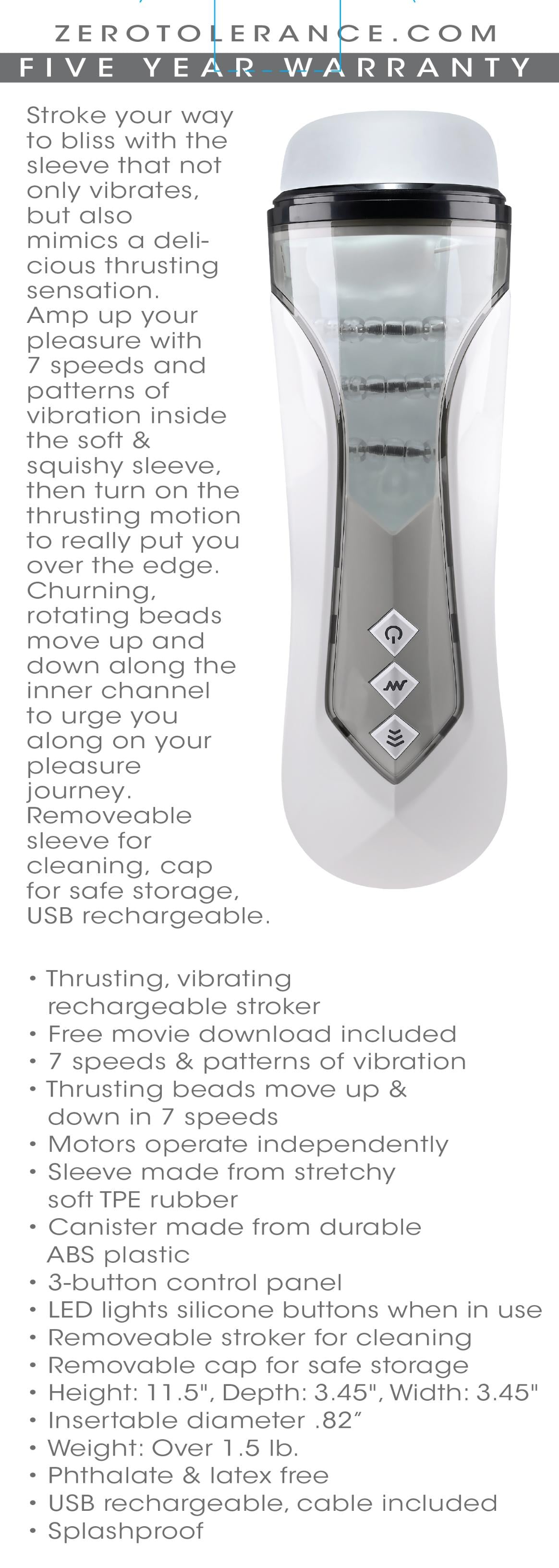 Stroke your way to bliss with the sleeve that not only vibrates, but also mimics a delicious thrusting sensation. Amp up your pleasure with 7 speeds and pattern of vibration inside the soft and squishy sleeve, then turn on the thrusting motion to really put you over the edge. Churning, rotating beads move up and down along the inner channel to urge you along on your pleasure journey. Removeable sleeve for cleaning, cap for safe storage, USB rechargeable.
