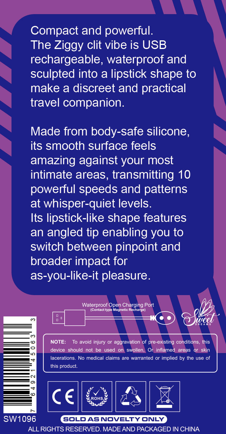 This compact, powerful, and discreet vibrator is meticulously designed to cater to your every desire with precision and care. The Ziggy is a compact and flexible powerful g spot / clitoral vibrator designed for unique personal pleasure and couples play. It features an remote Control and is equipped with rotation technology, allowing users to switch between 10 vibration patterns. The Ziggy is made of high-quality silicone, providing a luxurious feel. Its fully waterproof design and USB rechargeable capability ensure convenience and performance. The Ziggy is always ready to deliver profound pleasure whenever the moment strikes!