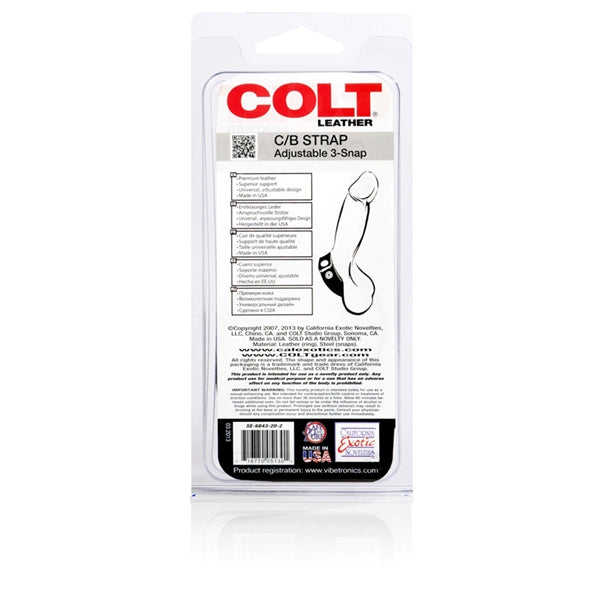 Colt Leather C/B Strap from California Exotic Novelties. Become the star of the night, just like a Colt man. The Colt Adjustable 3 Snap Leather Strap is soft and supple, made from high quality, hand double stitched material with secure snaps giving you the extra lift that you need to be the night’s star. Unleash your inner leather daddy with this beautifully crafted cock adornment for the ultimate in creating setting the tone in unbridled eroticism. Perfect for bondage themed role play or just showing off the goods, the Colt Adjustable 3 Snap Leather Strap will help you enjoy and establish dominant and submissive roles so you can indulge your every little desire. This soft black Leather Strap is designed to provide an extra lift for your cock and balls for just the right kind of attention. This adjustable three snap Leather snap is crafted from beautiful soft Leather, and the Snaps are Chromed Steel, providing the ultimate hardcore look, but the utmost in safety. This attractive Colt Adjustable 3 Snap Leather Strap will get you the gratification you crave. After all the fun is done, do not forget to clean the strap with warm soap and water. Cock and Ball Adjustable 3 Snap Cock Strap is soft and supple. High quality gear, hand double stitched plus secure snaps. For looks, for pleasure. Enjoy either way! Safe and pure for body and pleasure. Made using phthalate free, non-toxic materials Leather straps, Chromed Steel snaps. Cock Strap measures 9 inches long by .75 inch wide. Bulk weight .4 ounce. It is easy to clean with warm water and soap. Colt Adjustable 3 Snap Leather Strap is a registered trademark for California Exotic Novelties. Sex Toys and sexual wellness. Made in the USA. Categories: Cock Rings, Adjustable,Versatile Cock Rings, Men's Cock and Ball Gear, Gentlemen Cock Rings, Men's Fetish Wear. 2024.