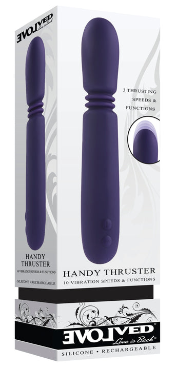 Evolved Handy Thruster Blue Vibrator for Evolved Novelties. Handy Thruster! Put powerful thrusting vibration in the palm of your hand with this hard working sex toy that delivers two deeply satisfying sensations in one pure Silicone shaft. The accordion neck at the base of the tip stretches up in 3 unique patterns to give you deep thrills: amplified by intense vibration if you desire. Each water submersible motor is controlled separately for deliciously customized pleasure. Handy Thruster features: 10 vibrating speeds and patterns. 3 thrusting speeds and patterns. 2 motors controlled separately. Size height 8 inches, depth 1.43 inches, width 1.43 inches. Insertable length 6.5 inches, insertable diameter 1.43 inches. Magnetic rechargeable, USB cable included. Made from body safe, phthalate free and latex free Silicone. Waterproof vibrations. Submersible water play. Do not use oil base personal lubricants. These can corrode the toys materials. Care: clean product with toy cleaner or soap and water. Followed by a warm water rinse. Pat dry before storing. Categories: Vibrators, Classic Vibrators, Rechargeable Vibrators, Palm Size Massagers. 2023.