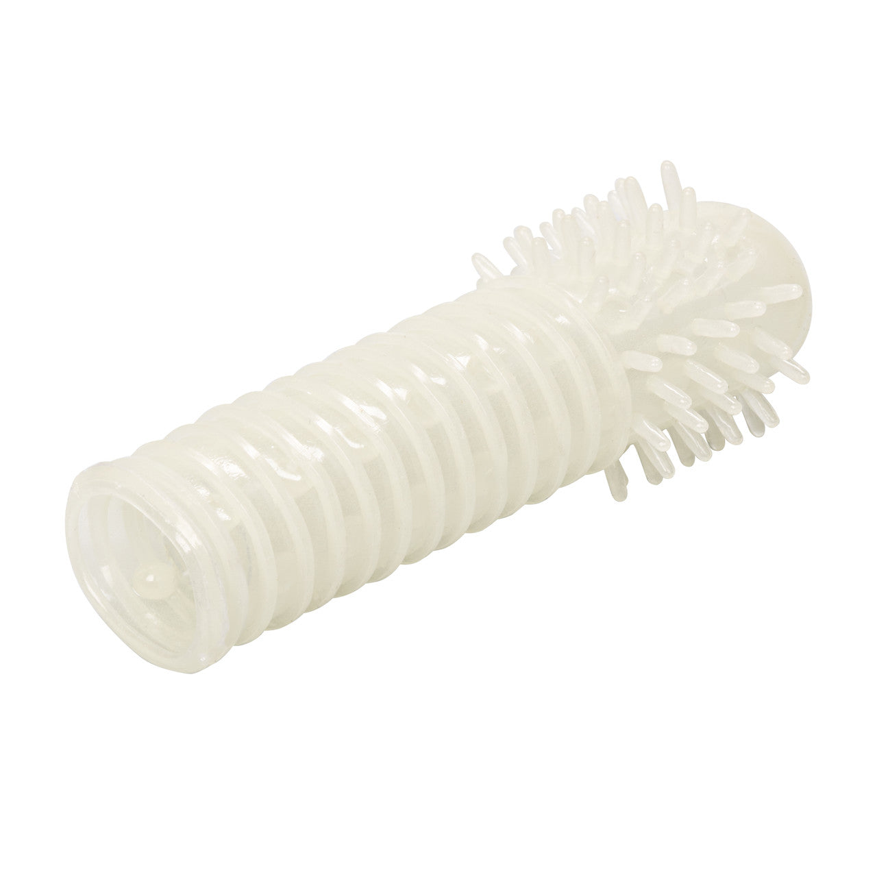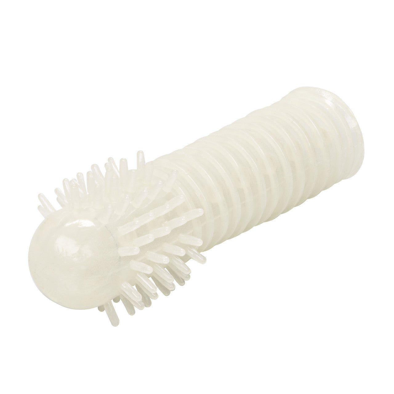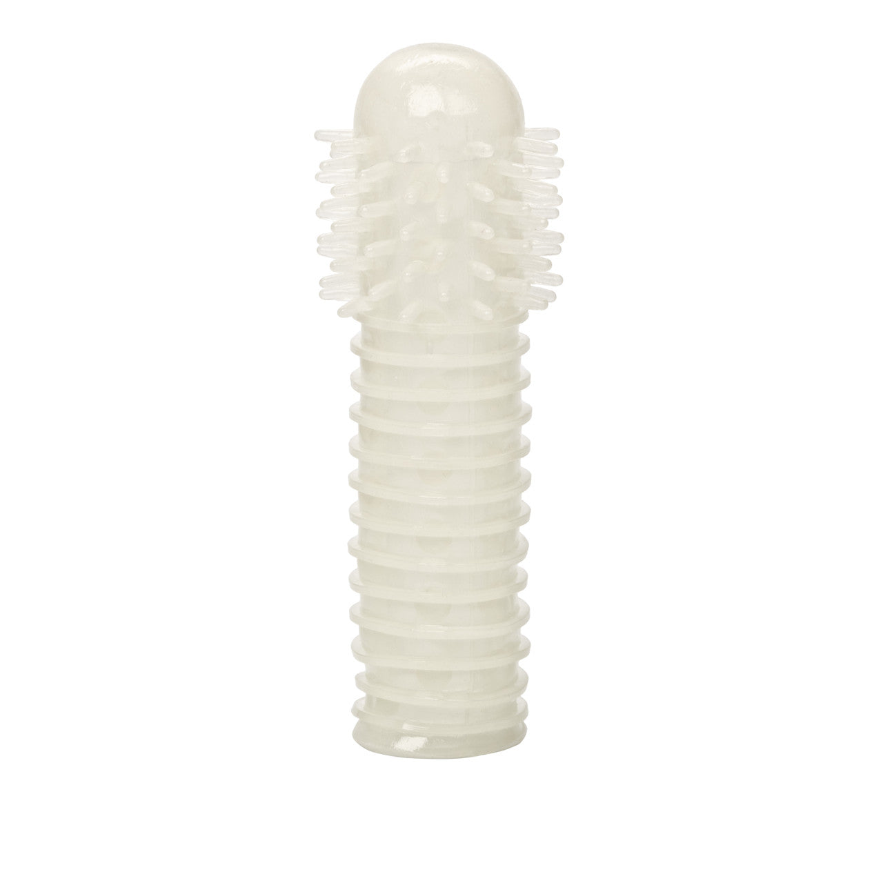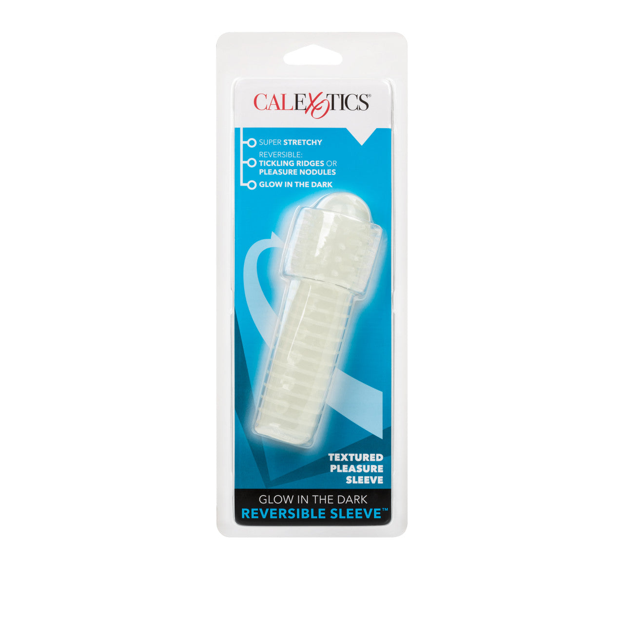 Glow-In-The-Dark Reversible Sleeve from California Exotic Novelties.The Glow-In-The-Dark Reversible Sleeve is an exotic pleasure stimulator for erotic solo or couples play. The slip on Sleeve can be used directly over the Penis, or as a tantalizing stimulating accessory on your favorite vibrator. The super soft and ultra stretchy arousal tool is perfect for first time and experienced users looking for new levels of intense intimate excitement. The pleasantly scented, Glow-In-The-Dark Reversible Sleeve comprises of a stretchy, comfort fit, Reversible Sleeve, with internal and external sensual stimulating ticklers, ridges, nubs and nodules. The arousal accessory is designed to offer a close comfort fit. The reusable pleasure tool accommodates the penis and delivers intense sensations and tingles for both partners. The nodules and nubs tease and excite and increase stimulation pleasure. How to use, insert the Penis into the Sleeve to experience ultimate orgasmic delight. If using the double sided Sleeve with a vibrator, slip it over the shaft and let the fun begin. For intense climax every time always use the Glow-In-The-Dark Reversible Sleeve with water based lubricant. The unique accessory’s Glow-In-The-Dark finish makes it the ideal pleasure tool for intimate fun after dark. To ensure the Sleeve is always ready for action, whenever you are in the mood, remember to clean it before and after every use. Wash the stretchy Sleeve in warm, soapy water, or clean it with a spray toy cleaner. Rinse with warm water. Pat dry before storing. Like two sex toys in one. Stretchy Glow-In-The-Dark Sleeve with stimulating nodules inside and out. Safe and pure for body and pleasure. Made using phthalate free, non-toxic materials Thermoplastic Rubber TPR. Sleeve measures 5.5 inches long by 1.4 inches wide. Bulk weight 1.5 ounces. Glow-In-The-Dark Reversible Sleeve is a registered trademark for California Exotic Novelties. Sex toys and sexual wellness. Categories: Penis Extensions, Sleeves, Rings, Vibrator Sleeves, Male Extensions. 2023.