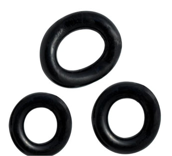 Lords of the Ring have forged 3 stretchy cock rings for those who long for support and pressure to prolong orgasm. Gently stretch one ring around the shaft for a firmer erection and intense orgasms. The material is hypoallergenic, washable with soap and water and doesn't pull on body hair. For best results, do not overstretch the rings.