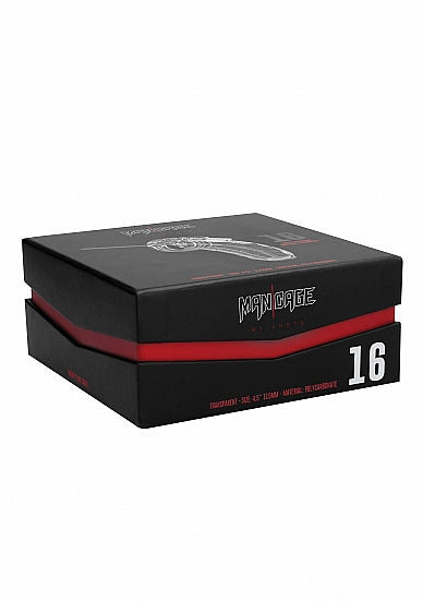 Mancage Model 16 Chastity 4.5 inches Cage with Plug from Shots Toys. This specific model is equipped with a urethral sounding dilator. Made from smooth, flexible medical grade silicone, which clicks into the bottom of the device and goes into the opening of the urethra. The total length of the dilator is 8.07 inches, the insertable length is 7.87 inches and the diameter is 0.137 inch. Dimensions package 6.1 inches by 6.1 inches by 2.95 inches. Weight package 12.98 ounces.