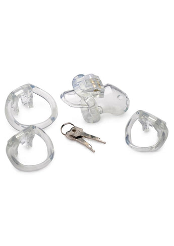 The secure locking mechanism secures this cage without pesky locks getting in the way! The Clear Captor includes two keys, one for you and the other for your sub in case of emergencies.