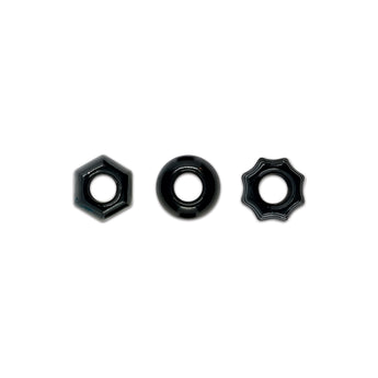 Renegade Chubbies Black Cock Ring Trio from NS Novelties. Comfort and control delivered by Renegade Chubbies. Super elastic, these stacking cock rings have multiple uses. Body safe Thermoplastic Elastomers TPE is suitable with all lubricants. Product dimensions 1.54 inches by 1.54 inches by 0.79 inch. Package dimensions 6.73 inches by 3.54 inches by 1.14 inches. Packaged weight 2.00 ounces. Product material TPE.