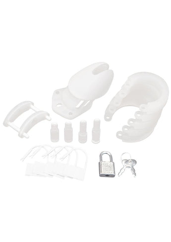 The Silicone Chastity Cage Device offers the best of comfort and security. The rings consist of three interlocking pieces that fit together. The two guide pins hold the top pieces together. The oval locking pin goes through the middle recessed hole connecting the cage portion to the ring. Assorted size rings and spacers included in each package allow you to customize fit. Restricts you from touching your genitals for sexual pleasure and gives the keyholder control over the sexual fulfillment.