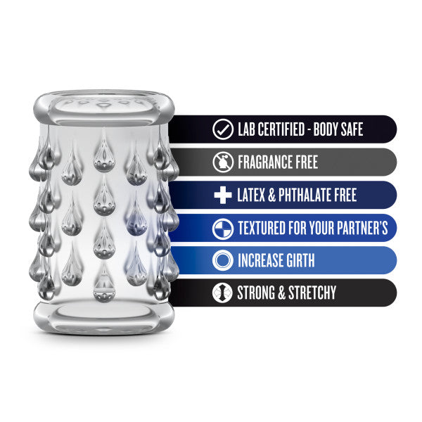 Stay Hard Cock Sleeve 05 Clear from Blush Novelties. This stretchy enhancement sleeve is a simple way to add a new level of pleasure and sensation to your penis, favorite dildo or vibrator. Just slide the sleeve over your shaft. Stack them for even more pleasure. Buy more so you can mix and match and stack them to create a unique erotic experience every time. Easy to use, and stays in place. Measures 2 inches in length by 1.4 inches in width. Cock Sleeve comfortably stretches up to 3 inches in width. Maximum stretches to 5 inches in width. Lab tested body safe. Silicone based lubricants, water based lubricants, hybrid lubricants compatible.