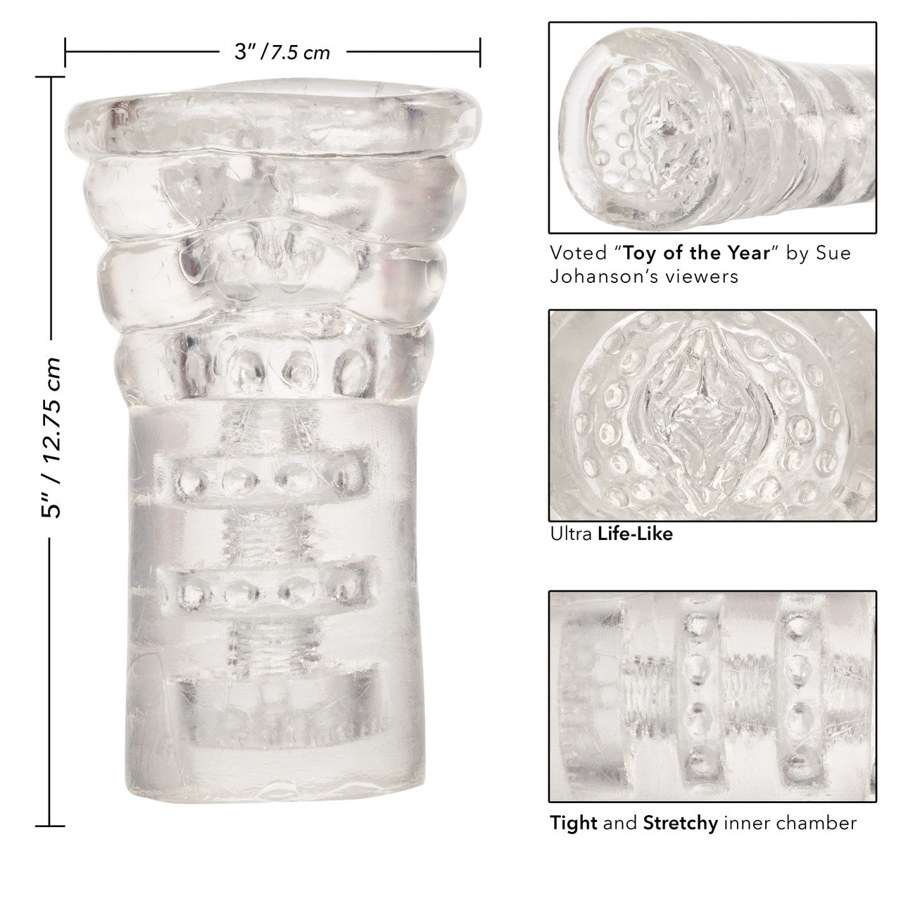 Sue Johanson Head Honcho Stroker from California Exotic Novelties. Slide inside Sue Johanson’s Head Honcho and experience the pleasure of a lengthy, realistic stroker designed to drive you wild. The Head Honcho was voted Toy of the Year by Sue Johanson’s viewers, and it is ready to provide the suction and tightness you need to make your ordinary stroking extraordinary. Sue Johanson’s Head Honcho is generously sized at 5 inches long and 3 inches wide for ultimate coverage and superior allover sensation. The Senso material makes for a soft, firm, and flexible feeling when immersing your rod that is made to feel like the real thing. Lube up your cock or soak your stroker in warm water for a breathtakingly good life like experience. Sue Johanson’s Head Honcho is super stretchy to accommodate your size and fit your erection like a sexy glove. It is also sturdy and perfectly tight to give you the added sensitivity and intense stimulation you crave. Thrust as hard as you like or tease yourself by going slow and deep. The Head Honcho is ready to please, no matter what your mood. The Head Honcho features three suction chambers to provide powerful pull and pressure against your erection that will have you exploding with ecstasy in no time. Indulge in a Masturbator that is made to service you in all the right spots with Sue Johanson’s Head Honcho. Sue Johanson's Head Honcho This super stretchy, translucent Thermoplastic Rubber TPR 5 inches long toy fits perfectly in the palm of your hand. The ribbed head provides better grip and prevents slippage. The entrance and interior tip both have raised nodules to increase stimulation on the head and base of the penis. The best part of this toy is the three extremely tight suction chambers. These three rings, each a half inch apart, contain their own set of nodules that massage and create positive friction along the shaft! Safe and pure for body and pleasure. Made using phthalate free, non-toxic materials Senso Thermoplastic Rubber TPR. A water based lubricant is recommended. Hand held male masturbation device measures 5 inches long by 3 inches wide. Always clean before and after use. Sue Johanson Head Honcho are registered trademarks for California Exotic Novelties. Sex Toys and Sexual Wellness. Categories: Male Masturbators, Sex Toys for Men, Health and Beauty Aids, Solo Masturbators, Masturbation Sleeves. 2023.