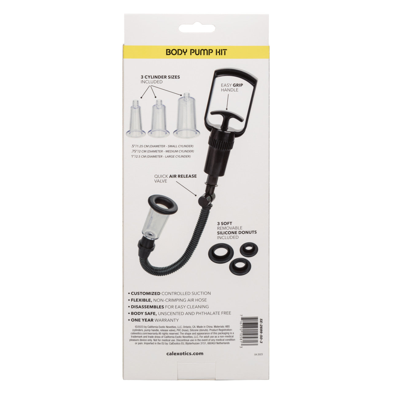 Boundless Body Pump Kit from California Exotic Novelties. Introducing the Boundless Body Pump Kit, a powerful and easy to use tool for customized and controlled suction. This Body Pump is designed to enhance your intimate experiences and provide thrilling sensations. The Body Pump Kit includes three different Cylinder sizes, allowing you to choose the perfect fit for your body. Each Cylinder is equipped with a soft, removable Silicone Donut for added comfort and a secure seal. The easy grip handle ensures a firm hold, giving you full control over the suction intensity. With its flexible and non-crimping Air Hose, this Body Pump Kit provides powerful and uninterrupted airflow. The quick release purge valve allows for quick and easy pressure adjustment, giving you the ability to customize the experience to your liking. When it comes to cleaning, the Body Pump Kit is designed with convenience in mind. It easily disassembles, allowing for thorough cleaning and maintenance, ensuring a hygienic and long lasting experience.