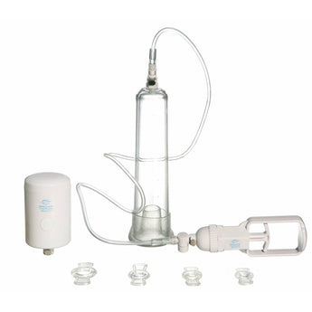 Sinclair Endow Vacuum Pump System. Overcome erectile difficulties with a vacuum therapy system that comes with two operating modes: an ergonomic hand pump and a battery operated pump. Connect with the 2 inch cylinder, slide your penis in and pump to engorge you penis to its maximum capacity, hardness and size. Set of 4 constriction rings maintain the erection for up to 30 minutes. Comes with 2 pumps with quick release valve, 10 inches long by 2 inches wide cylinder, removable gasket, connecting tubes, 4 constriction rings (.5 inch to .75 inch ), use and care directions. This pump is compatible with water based personal lubricant. It is not recommended to be used with silicone lubes. After use, carefully wash the pump with mild soap and water or try a sex toy cleaner for even quicker cleanup. Store this pump separately from other sex toys.