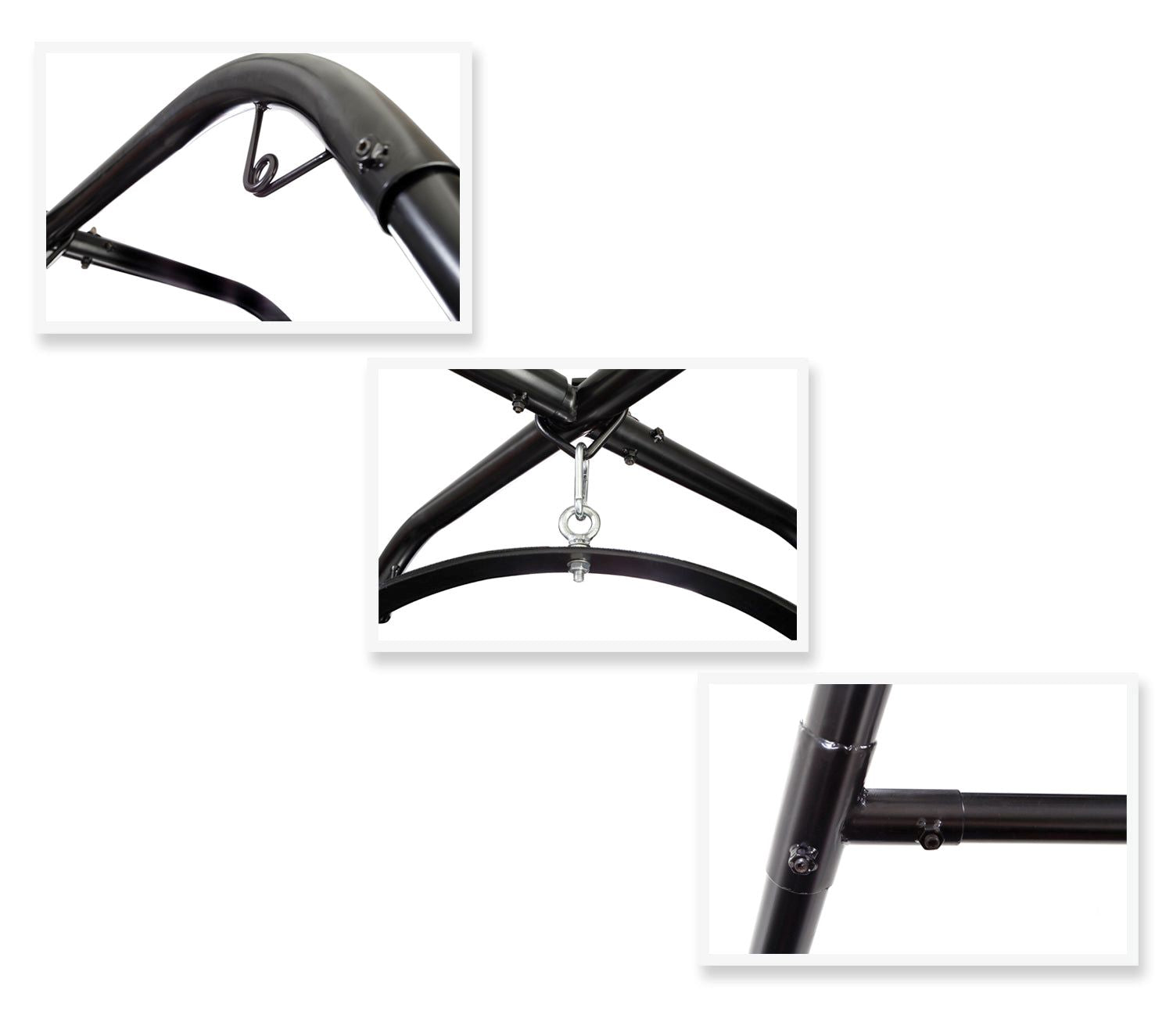 Fetish Fantasy Series Fantasy Swing Stand Black from Pipedream Products. Turns any room in your home into a bondage playground with the incredible Fantasy Swing Stand. Do not worry about drilling holes in the ceiling ever again the free standing Fantasy Swing Stand holds up to 400 pounds and works with any of our single support Fetish Fantasy Fantasy Swings. The heavy duty tubular steel frame provides plenty of stability and freedom of movement, allowing you to explore new positions you never thought were possible and swing your way into ecstasy. The wide standing frame assembles in less than 10 minutes with the provided assembly tool. No additional tools are required. The sturdy frame features built in Bondage Loops, allowing you to connect a variety of your favorite Fetish Fantasy bondage restraints, cuffs and ties to create exciting new bondage scenarios. You can instantly transform your ordinary sex swing into an amazing Bondage Swing by utilizing these built in steel loops, the possibilities for pleasure are endless! The frame also provides extra support for trying new positions in the swing. Both partners can use the heavy duty overhead bars and crossbars for added support, leverage, and to help maintain balance in the swing. Without a swing attached, the stand can serve as a bondage brace to hold your subject in captivity. When your done with the stand, the component parts break down easily in less than 10 minutes and can be stored or transported with ease. All necessary assembly hardware is included. Box dimensions 49 inches deep by 11.5 inches wide by 12 inches high. Shipping weight 49 pounds.