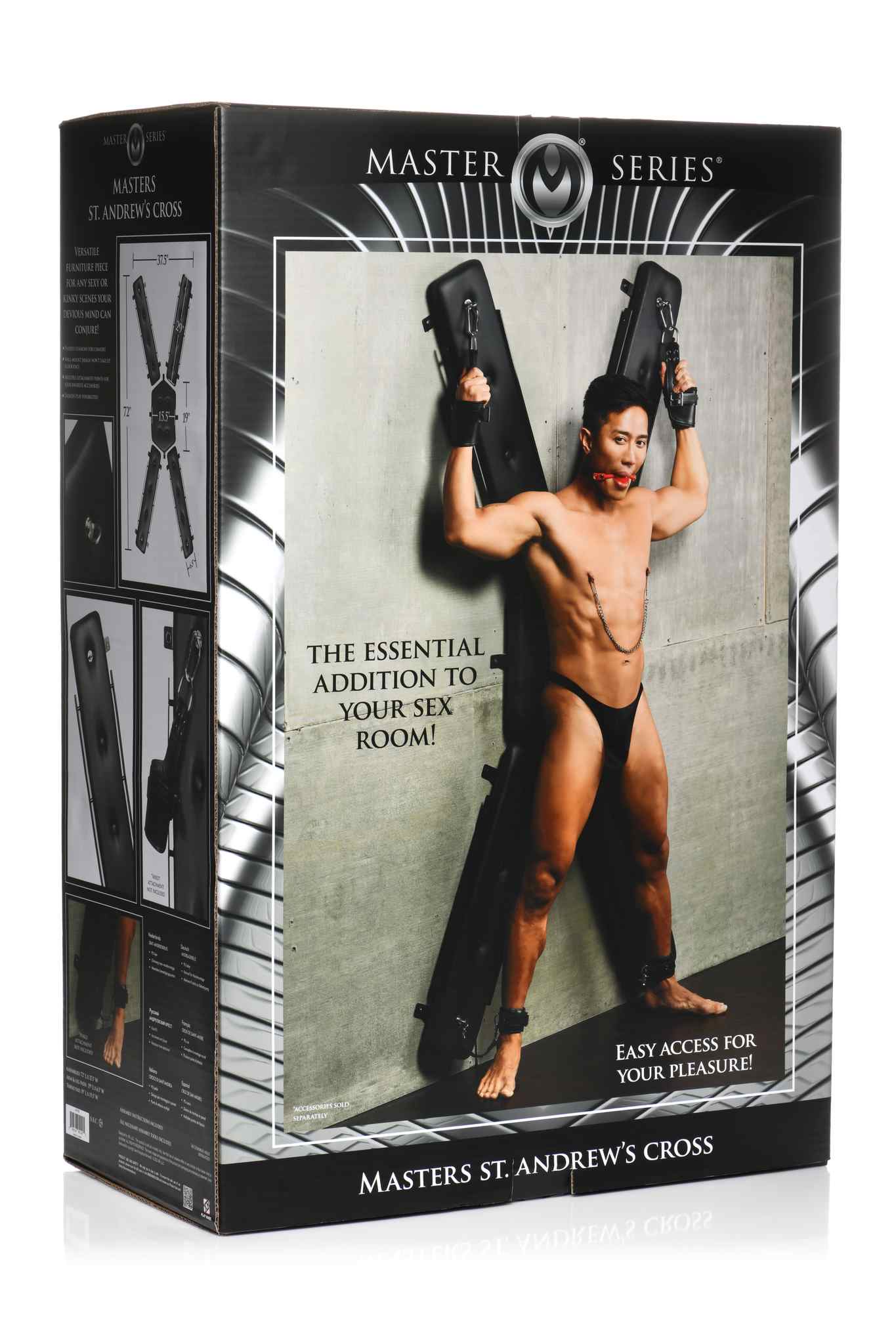 Master Series St. Andrew's Cross from XR Brands. Optimize your kinky play with this wall mounted St. Andrew's Cross! This plush, padded cross lays flat against the wall so you have more floor space! It is perfect for smaller rooms and gives you more square footage to place other kinky pieces in the room along with the cross. It is also great for rooms that have dual use such as a bedroom where you can hide a cross behind a curtain or dresser. The cross comes in 5 separate pieces and is shipped in a flat package discreetly to your address! Assemble it with the help of a drill and stud finder and place the 5 pieces exactly at the height that you prefer for easy and ergonomic scenes. The ultra plush pads are covered in PVC faux leather, are extra comfortable and easy to clean with a toy cleaner or isopropyl alcohol spray. Along the sides of each leg and arm pad are attachment points where you can attach wrist and ankle cuffs, rope, or other kink accessories! Get your submissive to stand upright for impact play whenever you like with this easy to install, easy to hide and compact St. Andrew's Cross! After mounting the cross securely to the wall of your choice, grab your favorite toys and kinky implements and place them nearby. After warming up your submissive, attach their wrists and ankles to the cross to keep them in place. You can have them facing forward or facing the wall. Once in place, feel free to use nipple clamps, floggers, whips, rope, gags and more! Your scene has just been amplified by a real St. Andrew's Cross in your sexy space! As you use the whips and floggers on them, you notice how much easier it is with a cross that does not take up much space! It allows you to have more room to use the impact tools and move around. When you are done with your scene, untie ropes or uncuff your submissive and bring them onto the bed, chair, couch or floor and give them some after care. Measurements: once assembled 72 inches length by 37.5 inches. Width arm and leg pads 29 inches, length 6.5 inches. Width Torso pad 19 inches length by 15.5 inches in width. Materials: PVC, Iron, Wood, Polyurethane PU. Color: Black. Note: screwdriver and 20 bolts are included. Set up will require a drill, drill bits and a stud finder. Key features: save on floor space! This upright St. Andrew's Cross lays flat against the wall so you can save on floorspace and it is easily hidden behind a dresser or curtains when not in use. Easily ships: five separate pieces are shipped flat and can be arranged any way you like to match your lover's height and torso once mounted on the wall. They can be rearranged in a way you prefer for a customized and optimal kink set up! Plush Pads: The PVC faux leather cushions on each of the arms and the torso board are extra padded for serious comfort! Durable frame. The frame is made out of wood and iron and holds up well during rough scenes. Multiple attachment points. Attach any kink accessories, rope, cuffs and more to the multiple points on the cross. Categories: Bondage, Fetish, Kink, Sex Swings, Machines, Erotic Furniture, Bondage Restraints, Sex Toys for Couples. 2023.