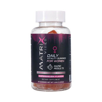 Embrace the power of comprehensive and natural self-care with our unique blend of 100% natural ingredients crafted not only to increase libido and sexual desire but also to promote overall wellness including healthier skin, hair, nails and general mood. Harnessing the benefits of ingredients such as astaxanthin and alpha-lipoic-acid, you can feel the synergy of our carefully selected elements working to improve your overall being and generate a rejuvenated glow throughout your entire body. Safe to add to your daily vitamin regimen, Matrix Vibes Daily Vitality Gummies for Women will elevate your libido and have you feeling great from the inside out.Delicious Watermelon FlavorElevates Libido30-Day SupplyVegan, Cruelty FreeIngredients: Organic Cane Sugar, Beet Sugar, Water, Pectin, Proprietary Libido Blend (L-Citrulline, Vitamin C, Damiana Extract, Mucuna Pruriens Extract, Maca Root Extract, Ginseng Extract, Wild Yam Extract, Fenugreek Extract, Zinc Oxide, Astaxanthin, Alpha Lipoic Acid), Natural Flavor, Citric Acid, Lactic Acid, Colors (from fruits and vegetables), Coconut Oil