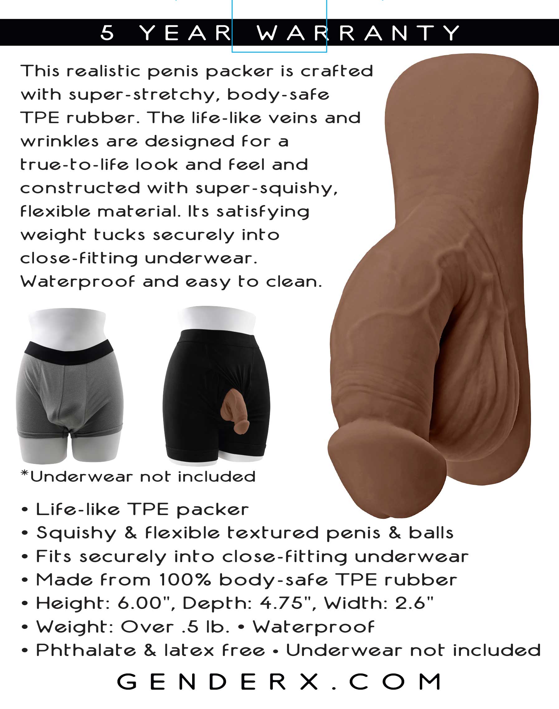 This realistic penis packer is crafted with super-stretchy, body-safe TPE rubber. The life-like veins and wrinkles are designed for a true-to-life look and feel and constructed with super squishy, flexible material. Its satisfying weight tucks securely into close-fitting underwear. Waterproof and easy to clean.