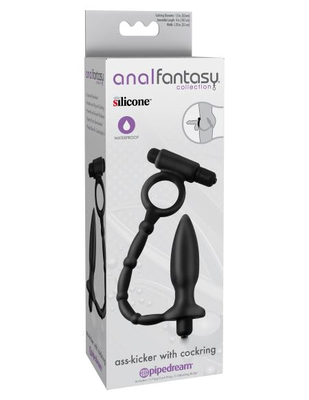 Anal Fantasy Collection Ass Kicker with Cock Ring from Pipedream Products. Enjoy the most explosive ejaculation ever with the Ass Kicker with Cock Ring. Made entirely from silky smooth Elite Silicone this wearable plug doubles as a performance enhancing cock ring, allowing the wearer to prolong ejaculation and extend the fun while enjoying incredible anal stimulation. With the Ass Kicker with Cock Ring in your ass and the ring wrapped snug around your cock, you will stay harder and stronger than ever before! The super stretchy Silicone ring puts the squeeze on performance letdowns, maintaining firm erections that last and last! The tapered tip of the plug ensures easy entry, while the thin neck and flange base keeps it comfortably in place even when the action heats up. Just a click of the button on both bullets will send thrilling vibrations around your cock and up your ass, making you cum harder than ever before! Ultra hygienic Elite Silicone is phthalate free, hypoallergenic, and can be worn all day for long lasting fun. Clean up is a snap after the fun with Refresh Anti-Bacterial Toy Cleaner and warm water. Plug insertion length 4 inches, plug width 1.25 inches. 90 days warranty. Categories: Anal Toys, Prostate Massagers, P-Spot Stimulators, Love Rings, Cock Rings. 2023.