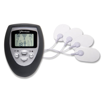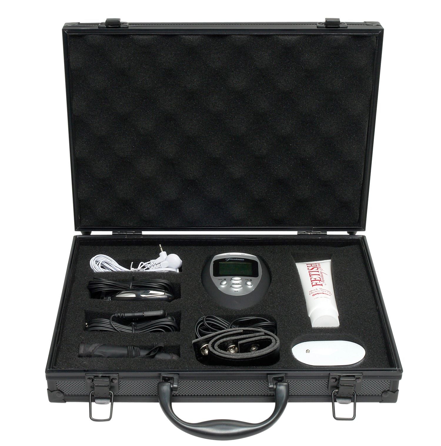 Fetish Fantasy Series Deluxe Shock Therapy Travel Kit from Pipedream Products. Give your sex life a charge with this incredible deluxe electro sex kit. This electric stimulation Shock Therapy Kit is perfect for first timers and those familiar to e-stimulation alike. The easy to read LCD screen on the digital power control unit clearly displays the function and intensity level, and with 3 pre-programmed pulsation patterns to choose from, this attractive control unit sends electrical impulses to whichever body part you place the pad on. Choose from a sensuous tingle to a throbbing tap, all with the push of a button, and pick one of the 5 body zones to stimulate. With over 100 stimulation combinations to choose from, the possibilities are endless. Choose a setting on the power unit's dial to control the intensity and go from a sensuous tingle to a throbbing tap in seconds. Switch between slow or fast to control the frequency of the shock, or adjust the dial to control the strength of the shock. Using the timer function, the battery-powered unit will automatically shut off after a 15 minute interval. The pads are self adhesive and reusable, attach to the lead wire using snaps, and clean up easily after the fun with Pipedream Toy Cleaner and warm water. Great for muscle stimulation, neural stimulation, and an all over relaxing electro massage! When you are ready to try something new, give your sex life a charge with the Shock Therapy Electric Nipple Clamps. Perfect for beginners and those new to electro sex, these spring loaded clamps plug into the electro power unit and provide thrilling e-stimulation. Take it up a notch with the Shock Therapy Cock Cage. This leather cock harness plugs into the electro power unit and provides thrilling e-stimulation. The comfortable harness easily adjusts to fit most sizes, with the larger strap wrapping around the balls and the smaller band wrapping around the shaft. Each strap is lined with small contact points that provide incredible sensations, and the cage doubles as a cock ring to help prolong ejaculation. Next try the Shock Therapy Pleasure Probe. This 3 inch torpedo shaped probe plugs into the electro-power unit and provides thrilling e-stimulation. The sleek design features a tapered tip and base, making it ideal for both vaginal or anal play. Apply a liberal amount of the Shock Therapy Electro-Sex Gel to the area of the body you want to stimulate and to eliminate hot spots. The gel magnifies the intensity of the electrodes and provides maximum conductivity between the skin and the Shock Therapy accessories. Includes: Shock Therapy Control Unit, Shock Therapy Nipple Clamps, Shock Therapy Electro Sex Pads, Shock Therapy Anal Probe, Shock Therapy Cock Cage, Shock Therapy Electro Sex Gel. Modulation frequency: 0.01Hz up to 1Hz, Pulse repetition frequency of less than 70Hz. Output pulse amplitude: 70-120Hz. Battery information requires 2 AAA batteries, not included. Case plus sex toys weigh 2 pounds 7 ounces. Materials: Vinyl, Metal, ABS Plastic. TENs sex play. Package depth 2.75 inches, width 12.75 inches, height 9.25 inches. Package shipping weight 2.5 pounds. Country of origin China. Harmonized Tariff Schedule HTS Code 3926909987. Categories: Bondage, Fetish, Kink, Sex Toys for Couples, Bondage, Fetish, Kink Kits, Sensual Kits. 2022.