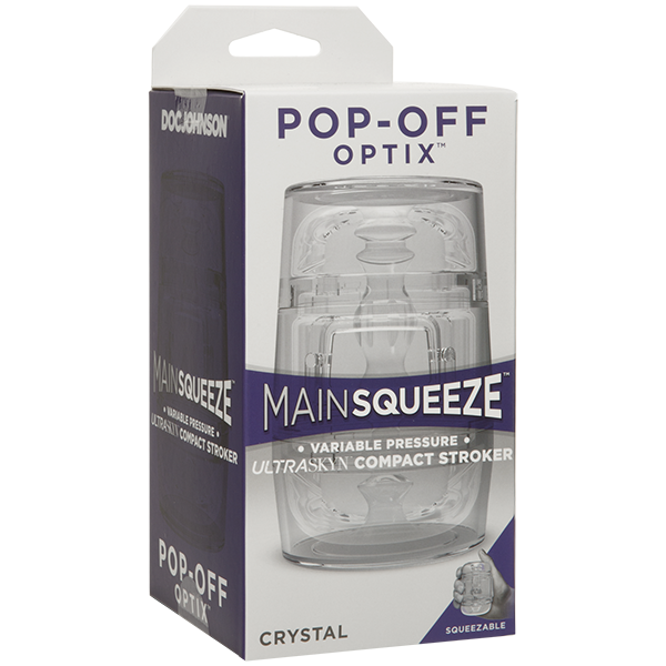 Main Squeeze Pop-Off Optix Crystal stroker. See yourself in a whole new way. This unique double ended addition to the Optix category of Main Squeeze variable pressure strokers features lifelike openings in the collection’s unique transparent design, scaled down to fit in the palm of your hand. Pop-Off’s hard plastic case and tight, textured Ultraskyn insert offer the same visually stimulating experience and squeezable, tightness controlling grip as the original in a discreet compact size. Details: lightweight masturbator with hard outer case. Visually stimulating transparent material. Lifelike ass and pussy openings. Great to use during couples play and oral. Mini squeeze plate allows user to control pressure. Fully disassembles for cleaning. Includes complete care and usage instructions.