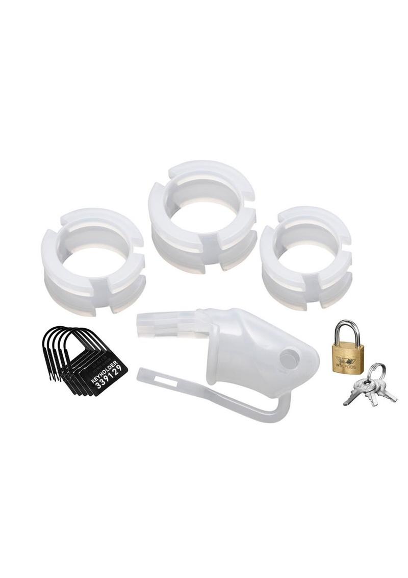 Sexual denial has never been this comfortably restrictive. Flexible and lightweight, the Sado Chamber Chastity Cage is designed for long term wear. This intriguing confinement piece will hold them in submission for extended periods, while remaining undetected under clothing. The cage and rings are made entirely of premium silicone. Choose one of the 3 provided rings, place it behind the cock and balls, then slide the cage over the penis. Slide the straps of the tie down straps through the cage. Lock them up using either the included padlock of individually numbered temporary locks. The cage of the piece is outfitted with ventilation holes, allowing the wearer to wash without removal. The Sado Chamber comes complete with a silicone cock cage, three sized rings, two tie down straps, a padlock with two keys, and five individually numbered plastic locks.
