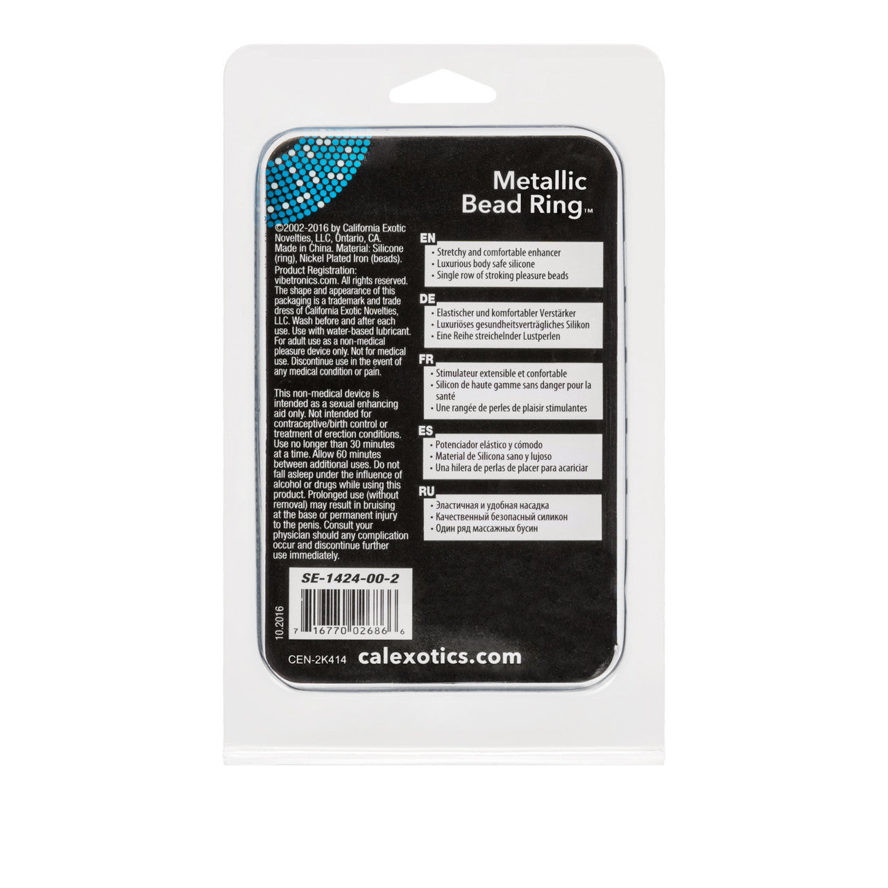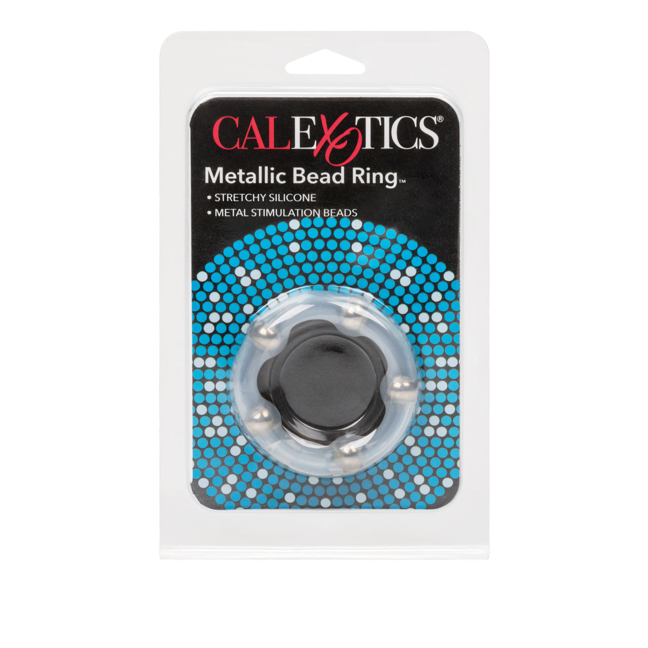 Metallic Bead Ring from California Exotic Novelties. Enhance your erotic encounters with the exotic Metallic Bead Ring. The stretchy and flexible erection enhancer is designed for intimate support and prolonged rock hard erections. The discreet Beaded Ring delivers tantalizing orgasmic sensations that stimulate your arousal and elevate your sensuous experiences. Slip the Ring on, and take full control of your pleasure, time and time again. Made from soft and smooth, superior Silicone, the Enhancer has a curvaceous tubed design and features 5 Steel stimulation Beads. The Enhancer Ring easily slides on to the erect Penis for instant and intense arousal assistance. The Metal Beads provide additional sensual stimulation during extended fun. Use your imagination and indulge in secret fantasies and wild dreams while the Ring supports and maintains your performance. For increased pleasure and heightened sensitivity, always use a quality water based personal lubricant with this sex toy. The reusable Enhancer is suitable for first time and experienced users, and great for spontaneous solo play. Use the enhancer during erotic intimacy with your lover, for prolonged mutual satisfaction and the ultimate climax experience. Before and after every use, remember to clean the enhancer with a toy cleaner spray or warm, soapy water. Rinse with warm water. Pat dry before storing. Stretchy is a Cock Ring with 5 Metal Beads. Safe and pure for body and pleasure. Made using phthalate free, non-toxic materials Silicone Ring, Steel Beads. Ring measures 1.25 inches in diameter. Bulk weight 0.5 ounce. Cock Rings when worn around the base of the Penis and Testicles, many users find that Cock Rings increase sexual pleasure. Prolong Rings, Erection Enhancement, Climax Control Rings, Cock Rings. Wash before and after each use. Always use a water based personal lubricant with this product for maximum pleasure. Important warning: this novelty product is intended as a sexual enhancing aid. Not intended for contraception, birth control or treatment of erection conditions. Use no more than 30 minutes at a time. Allow 60 minutes between additional uses. Do not fall asleep or be under the influence of alcohol or drugs while using this product. Prolonged use without removal may result in injury to the penis. Consult you physician should any complications should occur and discontinue use. Metallic Bead Ring is a registered trademark for California Exotic Novelties. Sex toys and sexual wellness. Categories: Bondage, Fetish, Kink, Love Rings, Sex Toys for Men, Cock Rings, Men's Cock and Ball Gear. 2023.