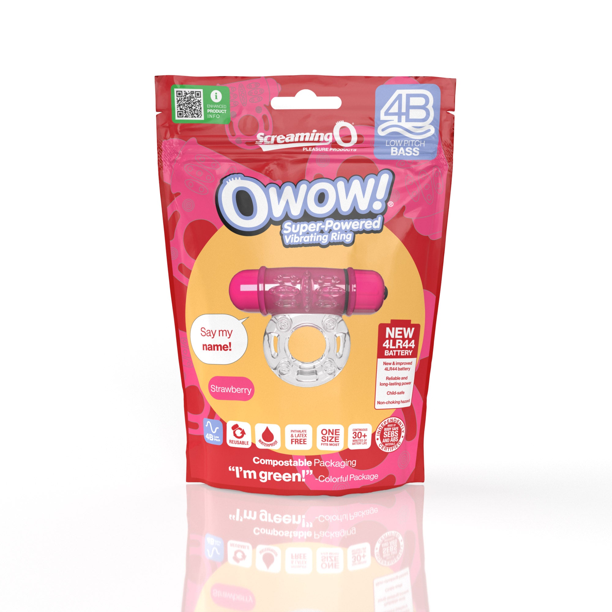 Screaming O 4B OWOW Strawberry Pink Low Pitch Bass Vibrating Cock Ring. 4B OWOW. From the Screaming O Collection. Deep rumbling bass vibration. 5 speeds plus one pulse pattern bullet. Super powered Vibrating Ring. Reusable. Waterproof vibrations for play outside the bedroom. Greener earth friendly packaging solution from Screaming O. Resealable zip top and made from ecological friendly, compostable materials. Featuring a new, better battery. New 4LR44 battery provides reliable and long lasting power. Child-safe. Non-choking hazard. How to use: twist turn cap to bullet vibrator. Remove tab. Hold down for 2 seconds to turn on vibrator. Continuous 30+ minutes of battery life. Independent certified made of body safe Silicone, SEBS Cock Ring, ABS Plastic Bullet Vibrator. Deep rumbling vibrations. 5 speeds and 1 pulse pattern. Double rings for a secure fit. Categories: Vibrators, Sex Toys for Couples, Love Rings, Vibrating Love Rings, Stimulating Cock Ring, Men's Cock and Ball Gear. 2023.