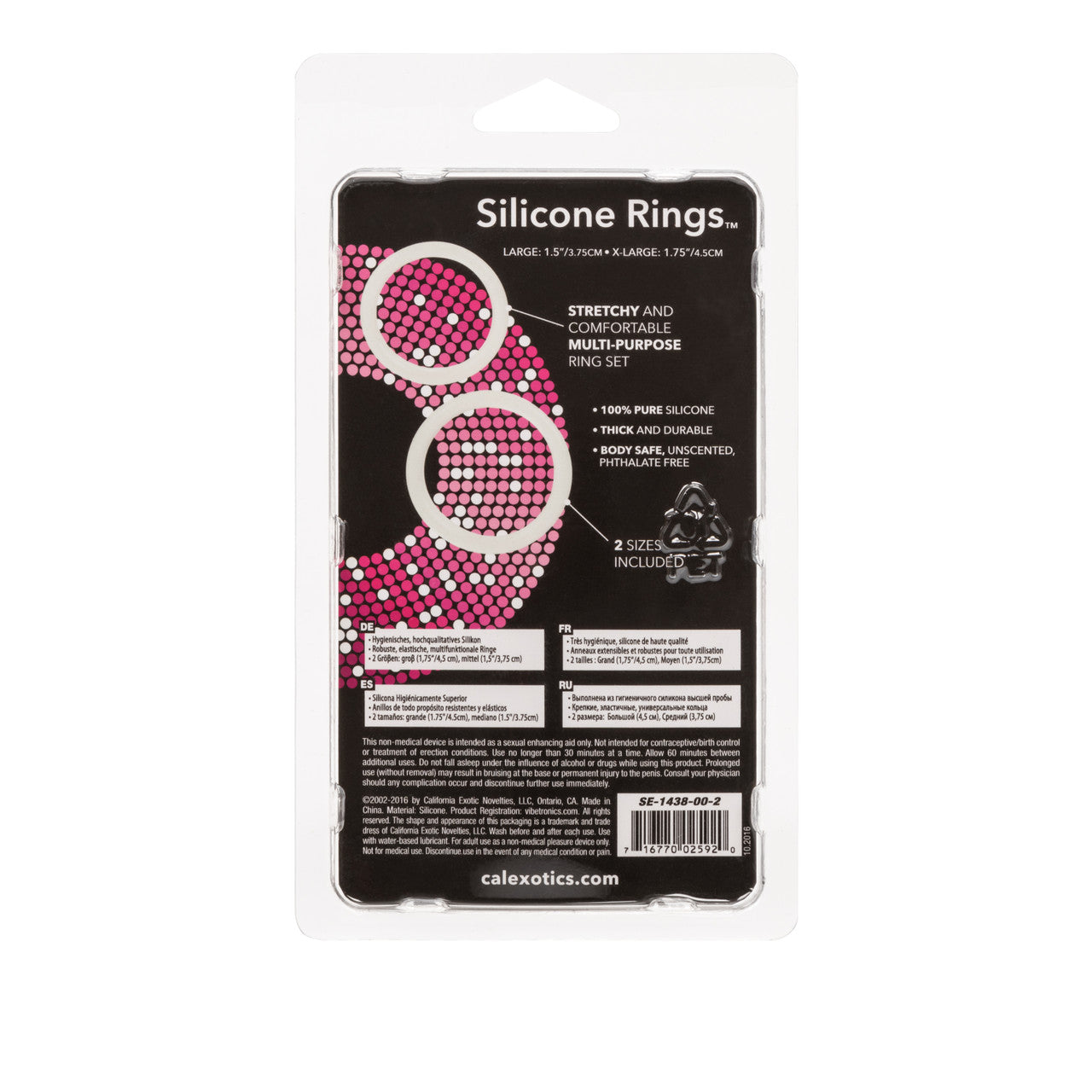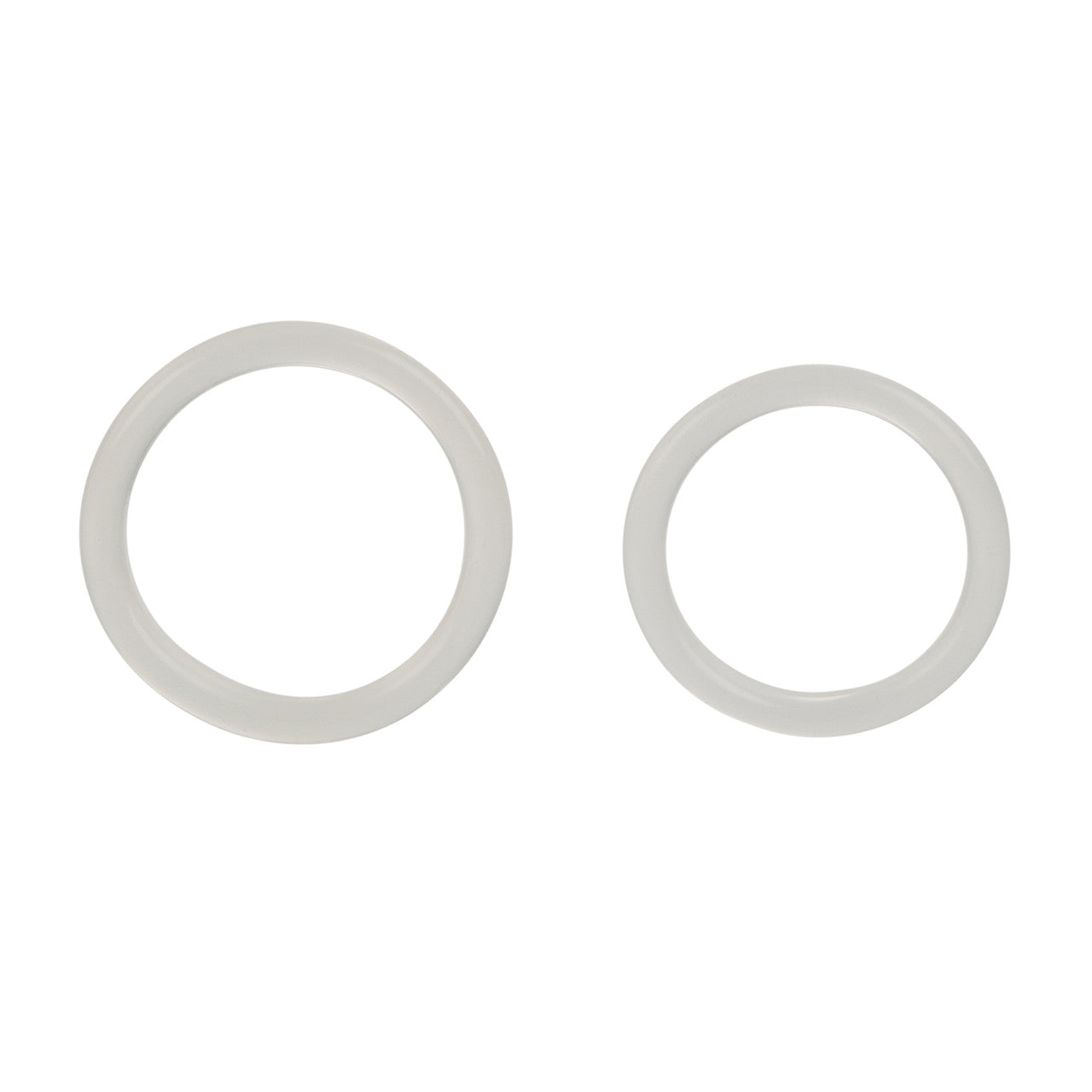 Silicone Rings Set Large and Extra Large stretchy erection enhancement Rings from California Exotic Novelties. Instantly super size your pleasure and ecstasy, with the easy to use Silicone Rings Set. The exotic erection keepers provide intimate support for stamina maintenance, peak performance, and extended sensual play. The comfortable to wear, super stretchy Rings are supplied in a pair and are designed for prolonged erotic encounters. The generous sized smooth and sensuous Rings maximize sensitivity and increase personal satisfaction for unforgettable experiences. The sleek enhancerset is made from unscented soft and smooth, phthalate free pure Silicone, for your maximum support and an elevated performance every time. The large and extra large, transparent stretchy enhancer Rings measure a 1.5 inches and 1.75 inches and has a sensuous streamlined design for easy use. For tantalizing pleasure, select your preferred Ring size and simply slide the onto the erect Penis. Get ready to enjoy unlimited orgasmic explosions that go on and on. To increase the seductive sensations, always use a quality water based personal lubricant with this sex toy. Play out your wildest secret fantasies with the Silicone Rings Set. The supportive flexible and durable Cock Rings are ideal for first time and experienced users, and perfect for spontaneous, intimate seduction. Slip on multi-purpose enhancer and indulge in mind blowing pleasure and endless ecstasy. Before and after every use, remember to clean the Silicone adornment rings with warm soapy water, or with a toy cleaner spray. Safe and pure for body and pleasure. Made using phthalate free, non-toxic materials Silicone. Diameter large ring is 1.5 inches. Diameter extra large ring is 1.75 inches. Do not wear a Cock Ring for more than 30 minutes. Cock Rings give you a longer lasting erection by trapping the blood supply in the penis and intensify orgasms. Cock rings are ideal for men with premature ejaculation or erectile dysfunction. There are no guaranteed results from cock ring usage. Silicone Rings Set is a registered trademark for California Exotic Novelties. Sex toys and sexual wellness. Categories: Bondage, Fetish, Kink, Sex Toys for Couples, Men, Women, Love Rings, Cock Rings, Classic Cock Rings, Men's Cock and Ball Gear. 2023.