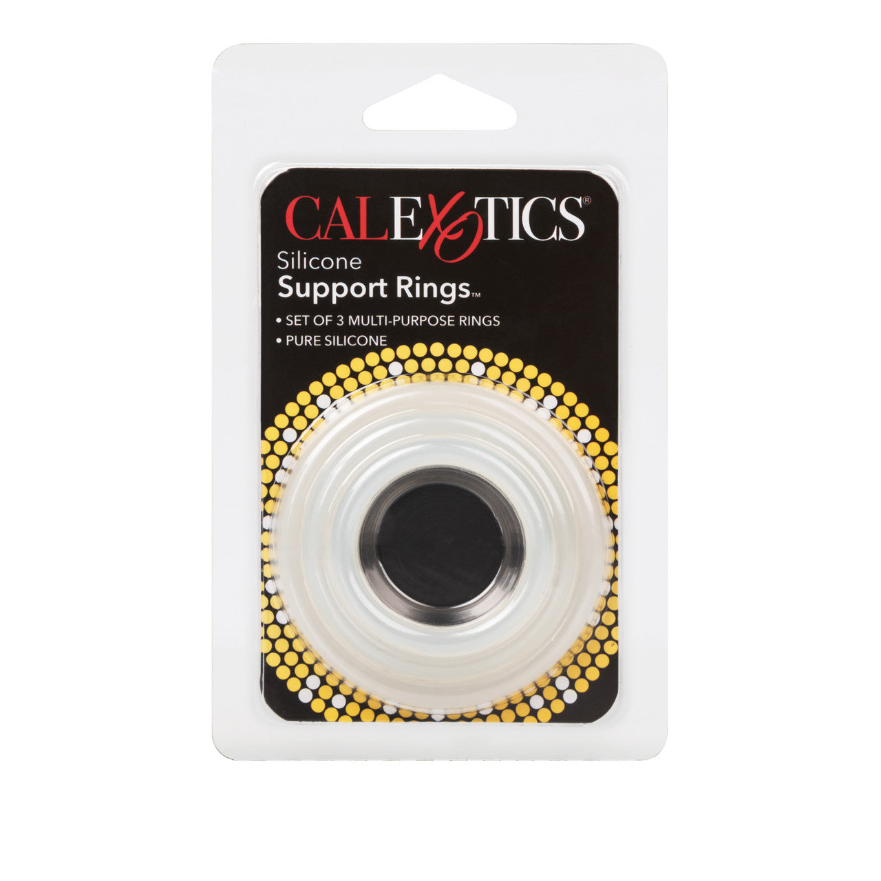 Silicone Support Rings Clear 3 Piece Set from California Exotic Novelties. Elevate your seduction performance and intimate encounters with the Silicone Support Rings. The durable, stretchy erection enhancers are easy to use, comfortable to wear and perfect for self gratification pleasure and exotic couple’s fun. The multi-purpose adornment Rings are the perfect accessory for exploring your secret erotic fantasies and wild desires. The comfortable enhancers are made from unscented 100% pure Silicone and are supplied in a set of three. The medium, large and generous extra large. Cock Rings are designed for erection stimulation and stamina maintenance. The pliable, sleek and smooth Rings comfortably slip onto the erect penis for arousal and stimulation support, during intimate solo exploration and intimate couple’s pleasure. To increase sensitivity and to maximize and heighten the ecstasy, it is recommended that you always use a quality water based personal lubricant with this erection keeper sex toy. Perfect for discreet performance maintenance, the enhancer set are great for spontaneous play, and are ideal for first time and experienced users. The individual enhancer rings can be used alongside your favorite vibrating stimulator toys for extended enjoyment. Slip on your preferred stretchy ring size and prepare to indulge in endless tantalizing explosions. Before and after every use, clean the premium quality Silicone adornment rings with a toy cleaner spray, or wash in warm, soapy water. Rinse with warm water. Pat dry before storing. Medium, Large and Extra Large multiple purpose Rings. 100% Pure Silicone. Medium Ring measures 1.25 inches diameter, Large Ring measures 1.5 inches in diameter and Extra Large Ring measures 2 inches in diameter. Bulk weight 0.5 ounce. Safe and pure for body and pleasure. Made using phthalate free, non-toxic materials: Silicone. Do not wear a cock ring for more than 30 minutes. Cock rings give you a longer lasting erection by trapping the blood supply in the penis and intensify orgasms. Cock rings are ideal for men with premature ejaculation or erectile dysfunction. There are no guaranteed results from cock ring usage. Silicone Support Rings is a registered trademark for California Exotic Novelties. Sex toys and sexual wellness. Categories: Bondage, Fetish, Kink, Sex Toys for Couples, Men, Women, Love Rings, Cock Rings, Classic Cock Rings, Men's Cock and Ball Gear. 2023.