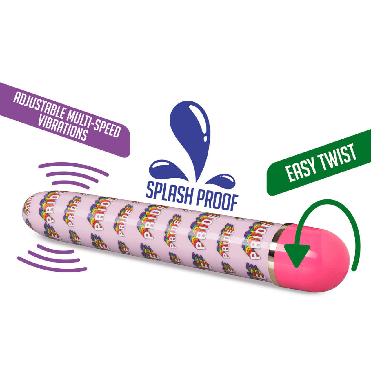 The Collection Pride Vibe Pink from Blush Novelties. Pride is a perfect gift for yourself or your lover. Power adjustable multi-speed vibrations. Easy. Splashproof and easy to clean. Peace of mind. Made of non-porous ABS Plastic. Contains no Phthalates or Latex. Size 7 inches in length, 5.75 inches insertable by 1 inch in width. Celebrate who you are with the Collection Pride Vibe. This vibrant, slim toy is a perfect gift, to yourself or a friend. Quiet and discreet, the Pride Vibe delivers strong multi-speed vibrations, controlled by an easy twist dial. Made of smooth ABS Plastic, it is body safe and splashproof for easy cleaning. Vibrator requires 2 AA batteries, not included. Blush Novelties - The Collection. Categories: Vibrators, Sex Toys for Women, Classic Vibrators, Firm Vibrators. Restricted, Amazon Restricted. 2024.