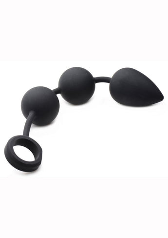 Explore a new level of anal pleasure with these unique anal beads that are not just huge, but heavy! These massive anal balls are internally weighted, with a silicone skin and convenient retrieval cord. The steel balls inside provide weight and resistance, while the silicone exterior provides a silky-smooth feeling. The first bulb features a tapered tip to make insertion more comfortable. The easy-retrieval cord has a large finger loop, also made of sturdy silicone, to tug these hefty spheres out at just the right time. The entire outside is non-porous, phthalate-free, and body-safe. Clean after use with mild soap or toy cleaner and avoid use with silicone lubricants.