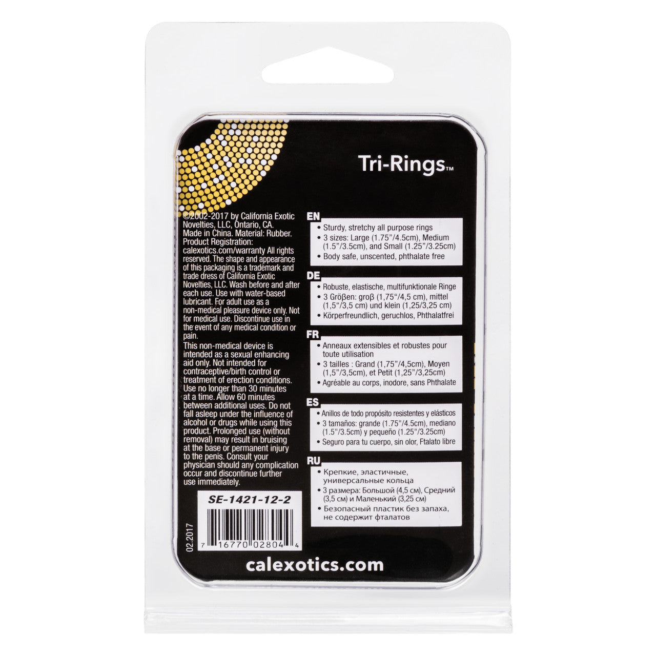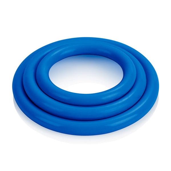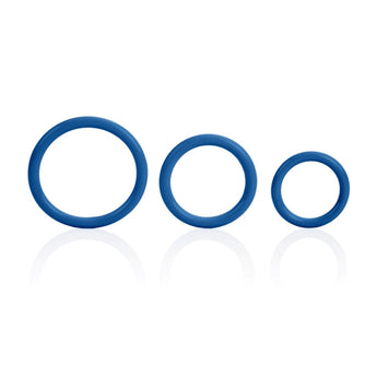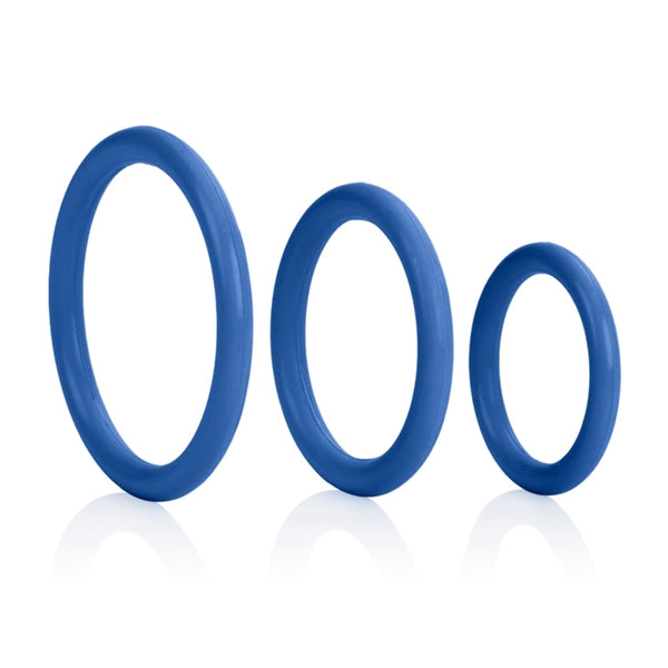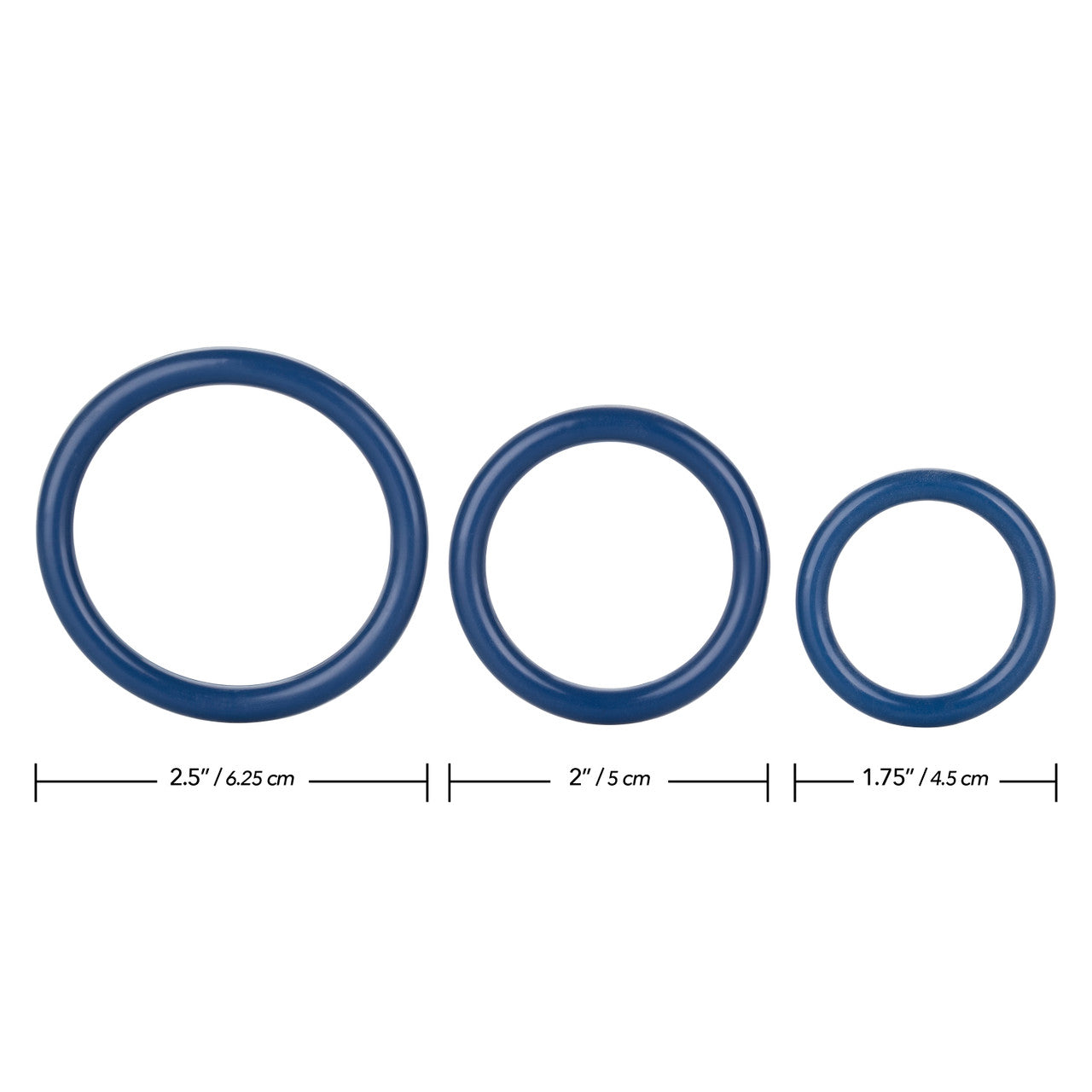 Tri-Rings Blue Set from California Exotic Novelties. Enjoy triple the erotic sensations and pleasure with the Tri-Rings. The discreet erection enhancers are easy to use and great for instant performance elevation, whenever you are in the mood for sensual seduction and endless satisfaction. The Rings are supplied in a choice of sizes for maximized and prolonged orgasmic ecstasy.The multi-purpose, reusable enhancers comprise of 3 different sizes that are designed to fit comfortably onto the erect penis, for stamina support and extended play fun. The sleek Rings are made from smooth, flexible Rubber and measure 1.75 inches, 2 inches and a generous 2.5 inches. How to use, slip the preferred Ring size on to the erect penis, and slide down to the base. The Rubber band provides support for longer lasting intimacy and rock hard erections. For increased pleasurable tingles and sensations, it is recommended that you always use a quality water based personal lubricant with this sex toy. The easy to use enhancers are ideal for the first time and experienced users and perfect for spontaneous, unlimited play. The Trio of erection enhancer Rings are great for self gratification exploration, and for extended couple’s foreplay fun. Use the medium, large and extra large Rings to enhance stamina and performance for a mind blowing experience every time. Together or individually. Before and after every use, clean the Rubber Rings with a toy cleaner spray or wash in mild soapy water. Rinse with warm water. Pat dry before storing. One each size: Medium Ring, Large Ring and X-Large Ring. The unstretched diameters are the following 1.75 inches, 2 inches, and 2.5 inches around. Bulk weight 0.4 ounce. Safe and pure for body and pleasure. Made using phthalate free, non-toxic materials Rubber. Wash before and after each use. Always use a water based personal lubricant with this product for maximum pleasure. Important warning: this novelty product is intended as a sexual enhancing aid. Not intended for contraception/birth control or treatment of erection conditions. Use no more than 30 minutes at a time. Allow 60 minutes between additional uses. Do not fall asleep or be under the influence of alcohol or drugs while using this product. Prolonged use without removal may result in bruising to the base or permanent injury to the penis. Consult you physician should any complications should occur and discontinue use immediately. Tri-Rings is a registered trademark for California Exotic Novelties. Sex toys and sexual wellness. Made in the USA. Categories: Love Rings, Cock Rings, Men's Cock and Ball Gear, Cock Ring Trios. 2023.
