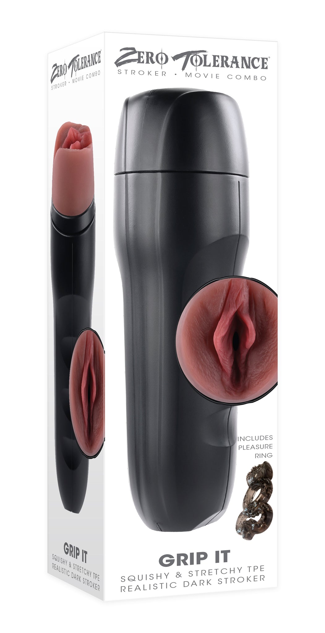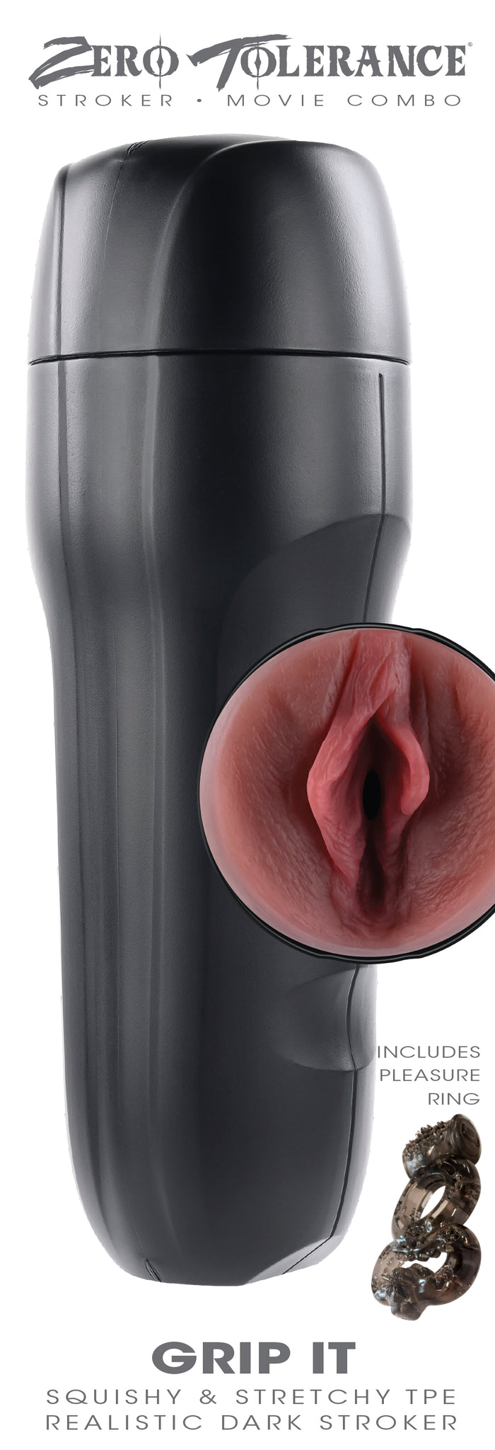 Zero Tolerance Grip It Dark Stroker from Evolved Novelties. Experience the ultimate release with this soft and stretchy canister stroker that is incredibly life like. Slip through the pink vaginal lips and feel the tight inner channel that is textured for a realistic ride, then enhance your experience with the squeezable canister that just might put you over the edge! Try the included vibrating Cock ring to keep blood flow at its maximum potential and watch the free movie download for erotic inspiration. Removeable sleeve for cleaning, water submersible.