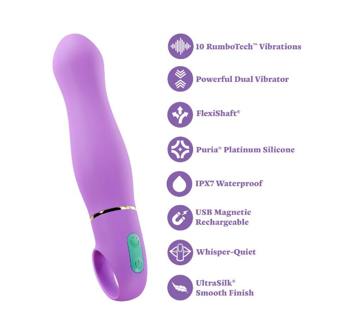 Beautiful and powerful, meet the Aria® Exciting AF. Featuring Blush’s signature RumboTech™ technology, this gorgeous vibrator offers 10 deep, rumbly vibration modes (5 Speeds & 5 Patterns) for a satisfying, full-body experience. The curvy silhouette enhances internal stimulation, while the rounded head is designed for deep, comfortable G-spot pleasure. The easy-grip loop handle provides comfort and control during every session, whether you're playing solo or with a partner. Crafted from Puria® platinum-cured silicone wrapped in UltraSilk®, this Aria vibrator is smooth, 100% body-safe, and feels amazing against the skin. It’s IPX7 waterproof for bath or shower play, and with magnetic USB charging, it’s always ready to deliver an experience that’s Exciting AF. Embrace the power of Aria!