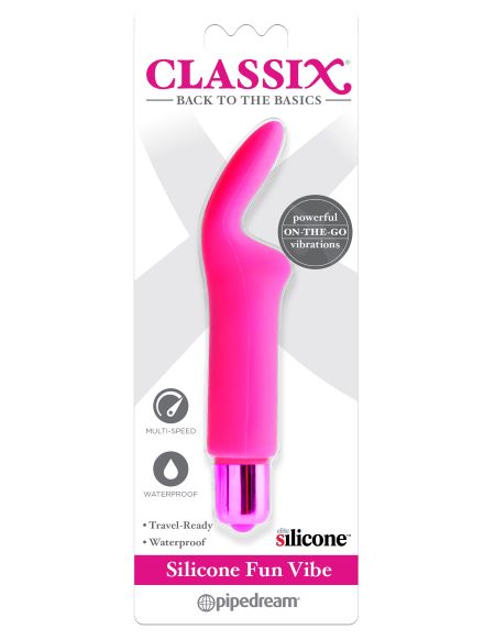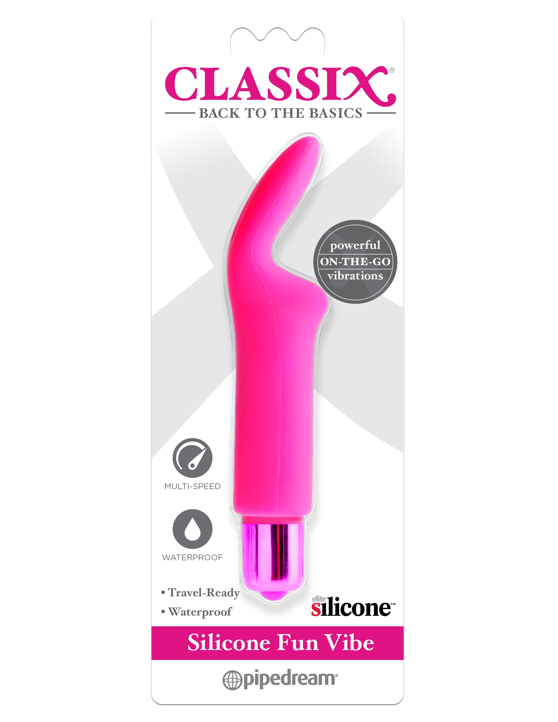 Classix Silicone Fun Vibe Pink from Pipedream Products. Perfect for first timers, this ultra smooth Silicone Fun Vibe offers powerfully satisfying 3 speed vibrations with the push of a button. Flickering ears tickle and tease sensitive erogenous zones, while the tip of the bullet provides pleasing pinpoint stimulation. Try it in the spa or shower and turn bath time into pleasure time! Features and benefits: Multi-Speed, Waterproof, Travel Ready. Care instructions: clean up is a snap after the fun with antibacterial toy cleaner and warm water. Specifications: SKU PD198211. Brand Classix Collection. UPC Code 603912757521. Materials Silicone vibrator sleeve, ABS Plastic vibrator. Warranty period 90 days. Packaging type: Clamshell.