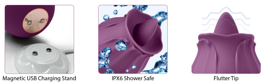 Features: body safe, hypoallergenic, hygienic and odorless. 10 adjustable stimulation modes. Rechargeable battery includes magnetic charger base. Size approximately 3.03 inches by 2.24 inches. 30 days warranty. Categories: Rechargeable Vibrators, Tongue Vibrators, Oral Products, Sex Toys for Women. New video. MAPs price $54.95 added. New image added with 3 specifications of the Tongue Clitoral Stimulator: magnetic USB Chargeable, IPX6 Shower safe. Flutter Tip Clitoral Stimulator image added. Restricted, Amazon Restricted. 2022.