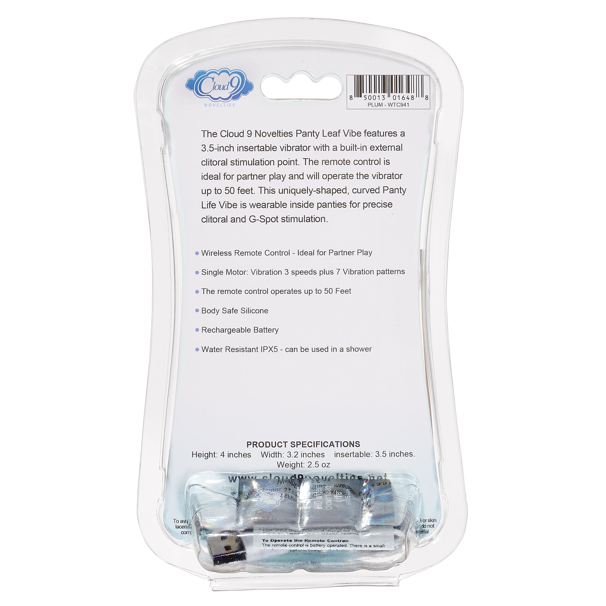 Cloud 9 Health and Wellness Wireless Remote Control Panty Leaf Vibrator Plum. WTC941 Wireless Insertable Panty Leaf Vibe with Remote Control Teal. The Cloud 9 Novelties Panty Leaf Vibe features a 3.5 inches insertable vibrator with a built in external clitoral stimulation point. The remote control is ideal for partner play and will operate the vibrator up to 50 feet. This uniquely shaped, curved Panty Life Vibe is wearable inside panties for precise clitoral and G-Spot stimulation.
