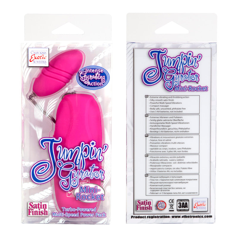 (D) Jumpin Gyrator Mini Rocket Pink Bullet Vibrator with attached power supply. Silky smooth, swirled, turbo powered, multiple use mini stimulator with extreme vibrating and gyrating action. Multiple speed vibrator comes equipped with an easy grip power pack plus an easy to operate slide control. Safe and pure for body and pleasure. Made using phthalate free, non-toxic materials: ABS plastic with a Polyurethane PU cote. Bullet vibrator measures 2.5 inches long by 1 inch wide. Bulk weight 2.3 ounces. Vibrating sex toy requires 3 AA batteries, not included. Do not leave batteries in the vibrator between uses. A water based lubricant is recommended. Category: For Women, Bullets, Beads & Balls, Bullets. Jumpin Gyrator Mini Rocket is a registered trademark for California Exotic Novelties. Sex toys and sexual wellness. New high resolution images added. Categories: Vibrators, Bullets, Eggs, Sex Toys for Women, Vibrating Bullets and Eggs. No longer available. 12/22/2023. IA.