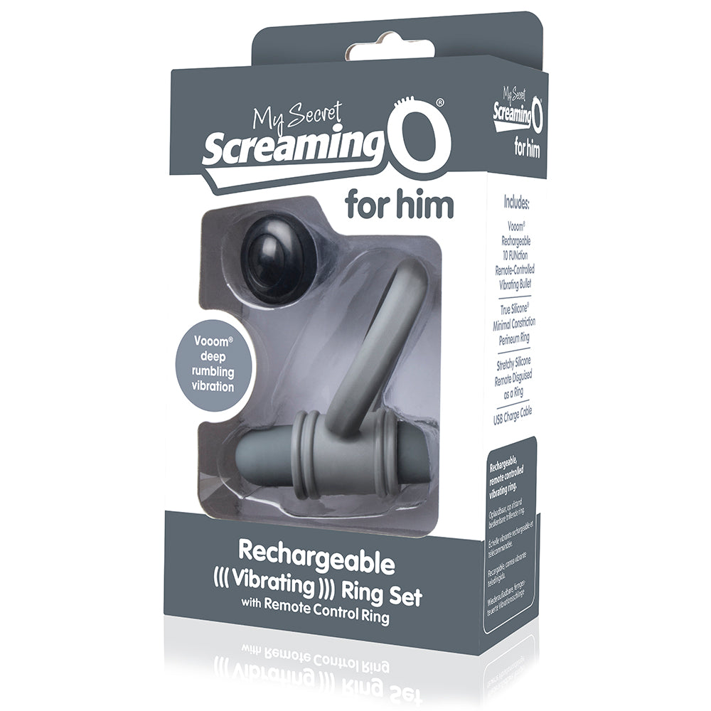 My Secret Screaming O Bullet and Ring for him for hands free perineum or testicle massage. Powered by deep rumbling Vooom vibration. 100% waterproof bullet vibe. Clever one size remote control disguised as a finger ring. Lab tested, body safe True Silicone cock ring and ABS plastic bullet vibrator. My Secret Screaming O Rechargeable Bullet and Ring for Him makes it easy to play in public with a compact rechargeable waterproof bullet vibe that positions perfectly against the perineum or testicles (your choice!). This USB rechargeable mini vibe comes with a clever remote control that looks like an ordinary finger ring, so you can enjoy hands-free fun on your own or wear it out on the town. You can even try it with a partner and watch each other quiver from across the room. This remote operated vibe works from up to 50 feet away! Powered by deep rumbling Vooom vibration, My Secret Screaming O Rechargeable Bullet and Ring for Him is positioned at the perfect angle with a wide stretchy True Silicone ring to keep it in place. With little to no constriction at all, users can comfortably wear the sling around their penis and testicles and choose from two different pleasure experiences: Wear the bullet facing away from the body for testicle massage or angle it toward the body for perineum massage, you get to choose what kind of hands free fun you feel like having! My Secret Screaming O Rechargeable Bullet and Ring is powered by a 150mAh rechargeable battery for more than 60 minutes of rumbling bliss and boasts 10 functions of rumbling vibration that work with or without the remote control. The discreet remote control is made of soft and stretchy silicone to fit most fingers. Color Gray. No longer available. 2023.