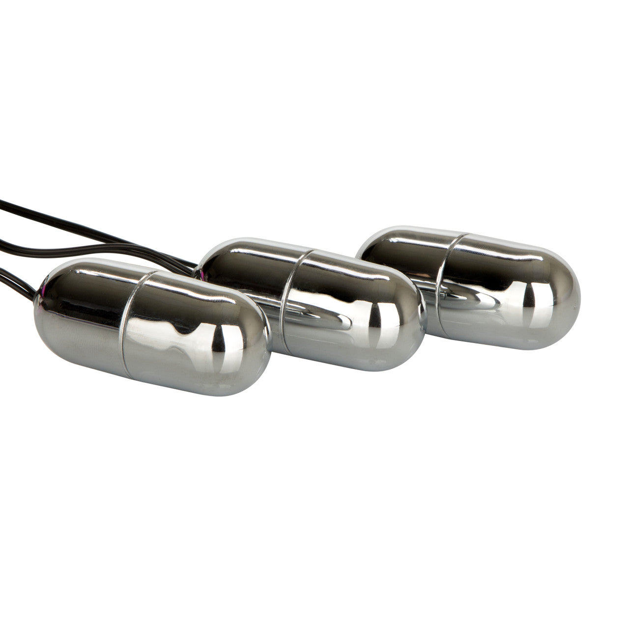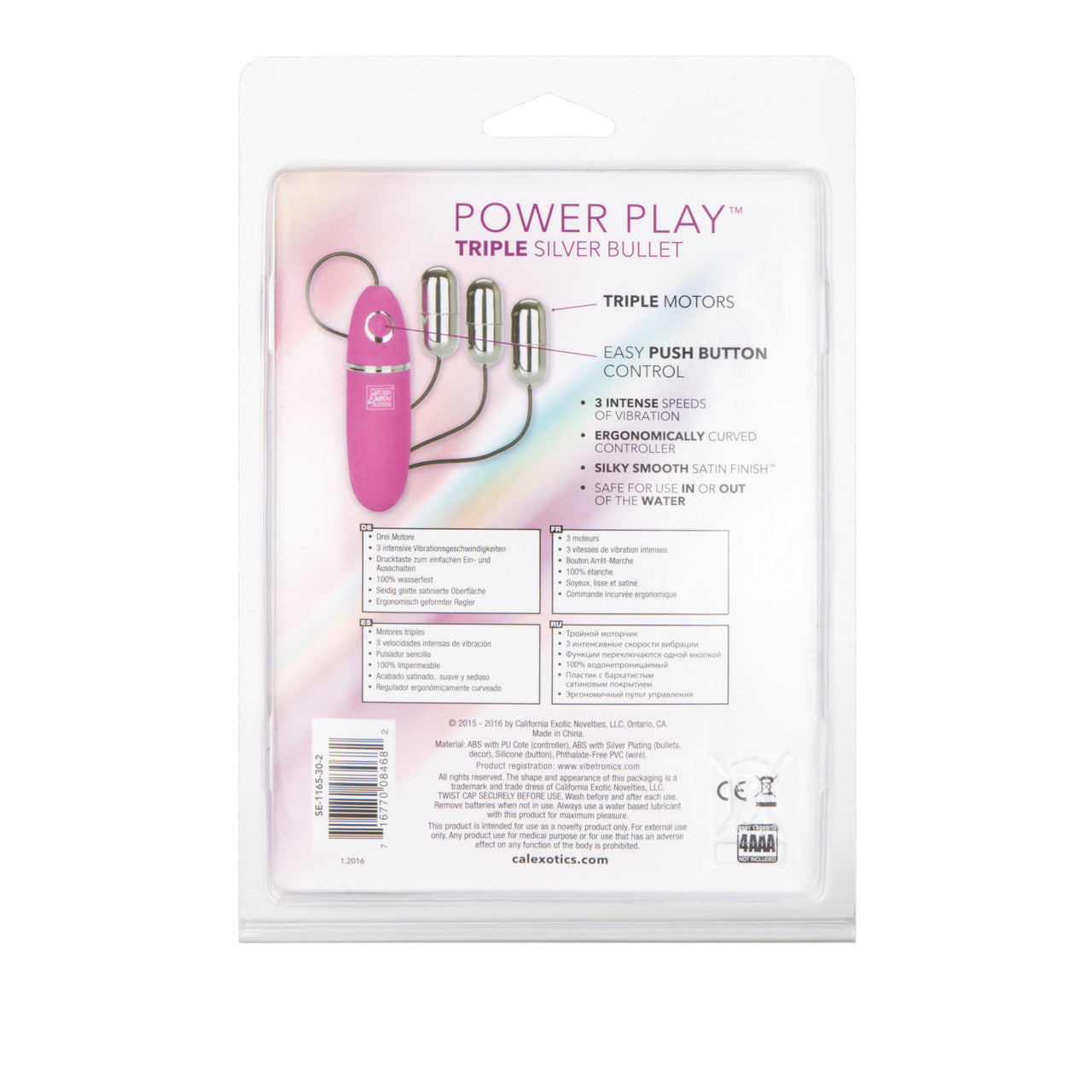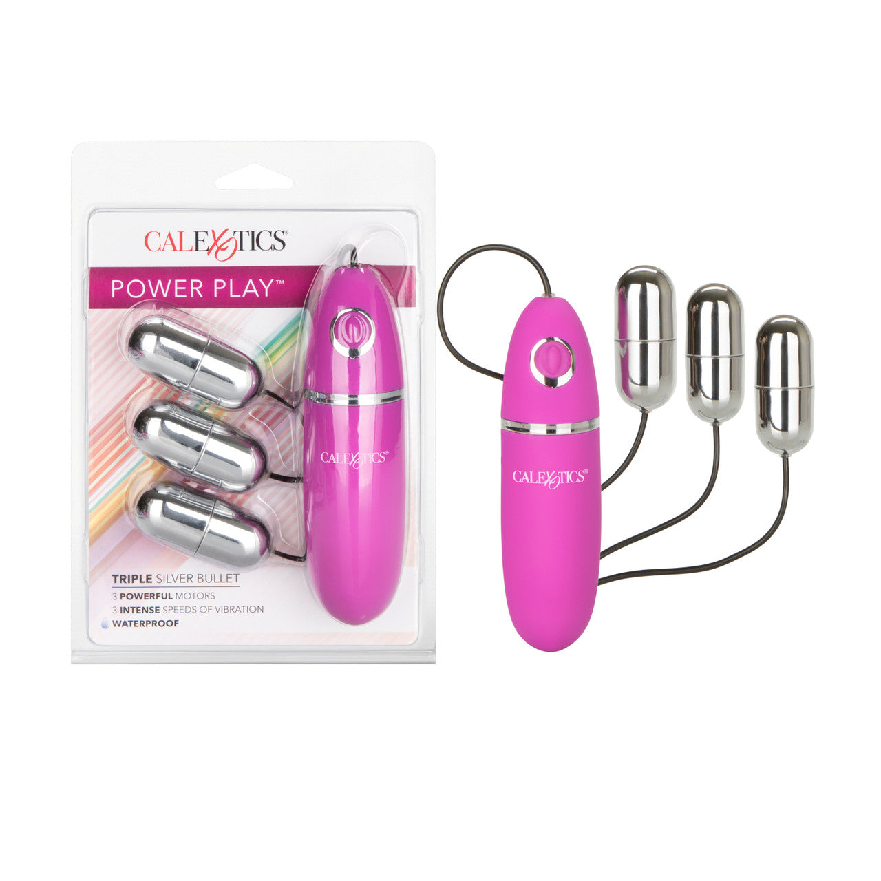 (D) Power Play Triple Silver Bullet Vibrators from California Exotic Novelties. Three vibrating bullets means three times the fun and three times the pleasure. Lay back and let yourself be engulfed by powerful waves of vibrating pleasure from three directions. The power play triple silver bullet is perfect for both solo and partnered play. Explore yourself with one, two, or all three Bullet Vibrators at once and get ready to transport yourself to a place of unbelievable ecstasy. No longer do you have to choose between full coverage feeling and the heavenly experience of pinpoint precise bullet vibrations. Lay one on your clit, another on your lips, and let the last one explore those super sensitive anal nerve endings or any other combination you crave. Each spot will benefit from the explosion of centralized pleasure that Bullet Vibrators are famous for, but you will get three times the ecstasy and be tempted to go for three times the orgasms with this chic and sensual massager. Each Bullet Vibrator is 2.25 inches long by 1 inch wide, making the Triple Silver Bullet Vibrators the perfect size to slip into your purse for fun at any time. It is entirely waterproof for fun in the tub, the shower, or anywhere else you can imagine. The Triple Silver Bullet Vibrator is packed with 3 intense speeds of vibration that radiate from each individual bullet vibrator, ready to please you exactly as you crave. The ergonomically curved controller makes switching speeds easy and downright luxurious. The triple Silver Bullet Vibrator is sensual, chic, and glam all rolled into one so what are you waiting for? Slip in 4 AAA batteries and get ready to be whisked away on a breeze of bliss. Incredibly powerful silver bullet. 3 intense speeds. Ergonomically curved controller with easy push button control. Waterproof for play in and out of the bedroom. Safe and pure for body and pleasure made using phthalate free materials ABS plastic with polyurethane PU Cote controller, ABS Plastic with Silver Plating Bullet Vibrators, Decor, Silicone button. Bullet vibrator requires 4 AAA batteries, not included. Bulk weight 6.4 ounces. 2.25 inches by 1 inch each bullet. 1 year warranty. Categories: Vibrators, Bullets, Eggs, Sex Toys for Men, Women, Couples, Vibrating Bullets and Eggs. No longer available. 2023.